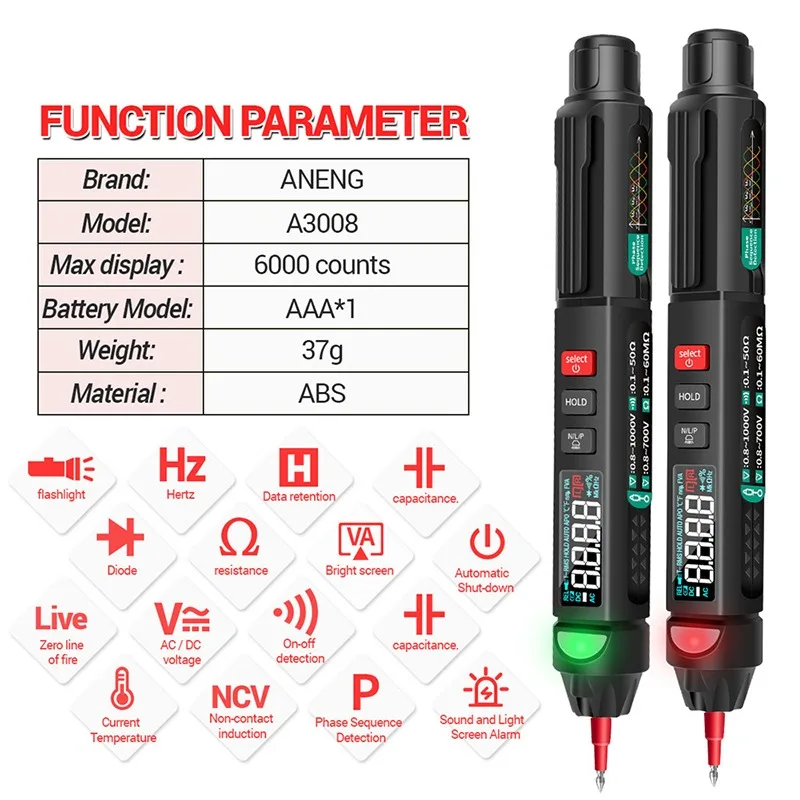 Электрический мультиметр A3007 A3008, профессиональный цифровой полимерный инструмент с автоматическим индикатором напряжения и умным датчиком
