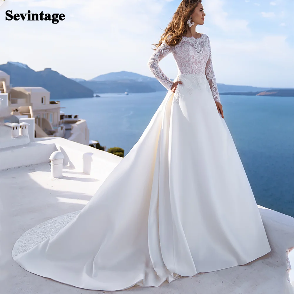 Свадебные платья Sevintage в стиле бохо, роскошные мягкие атласные с круглым вырезом и длинными рукавами, с открытой спиной, искусственная кожа, свадебные платья