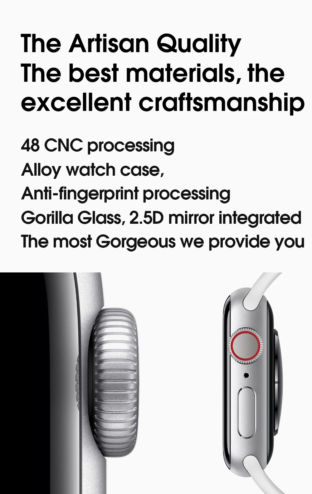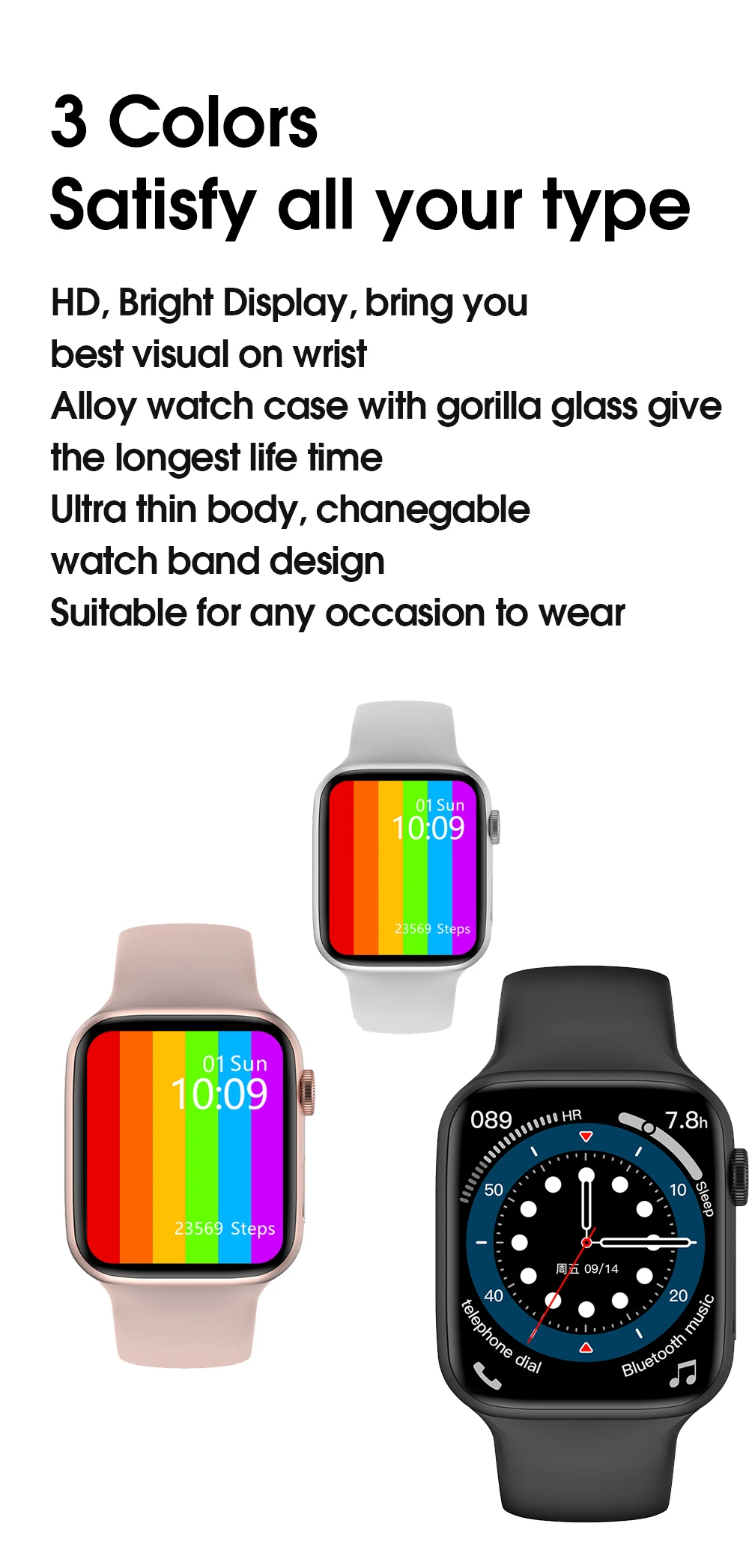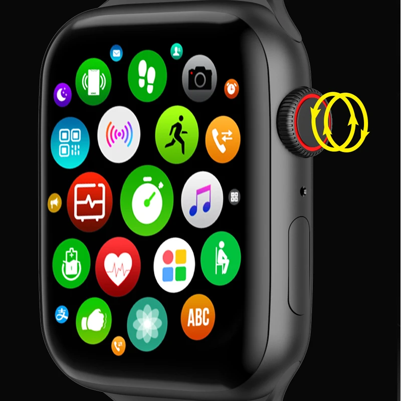 Bluetooth Вызов, загрузка циферблата, частота сердечных сокращений, ЭКГ, кровяное давление, шагомер, фрукты 6-го поколения Размер, сменный 44 мм ремешок, умное меню в стиле сот, девять квадратных сетки меню, IP68 водонепроницаемый, поворотная кнопка, Беспроводная зарядка