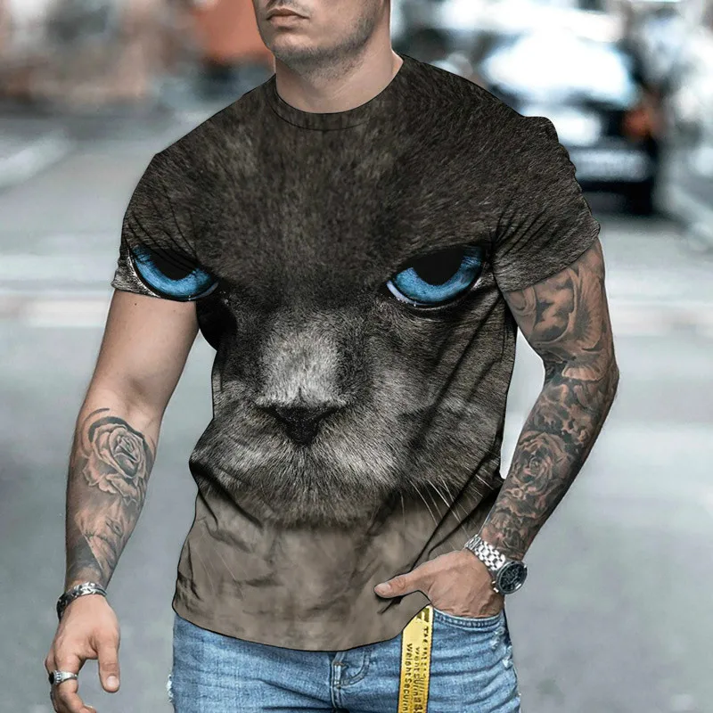 Летние мужские и женские футболки, индивидуальный 3D топ с круглым вырезом и принтом кошки, с коротким рукавом, свободная одежда