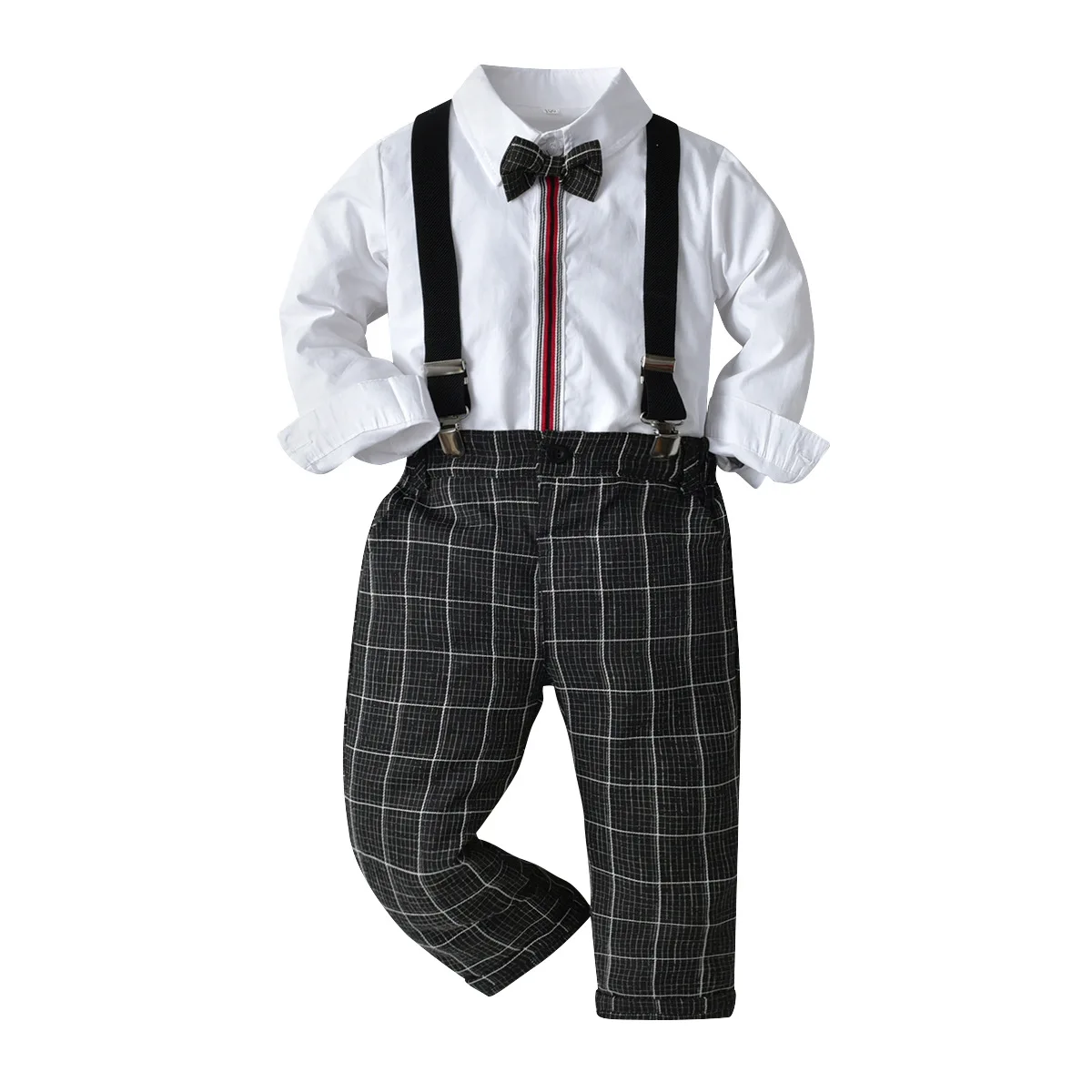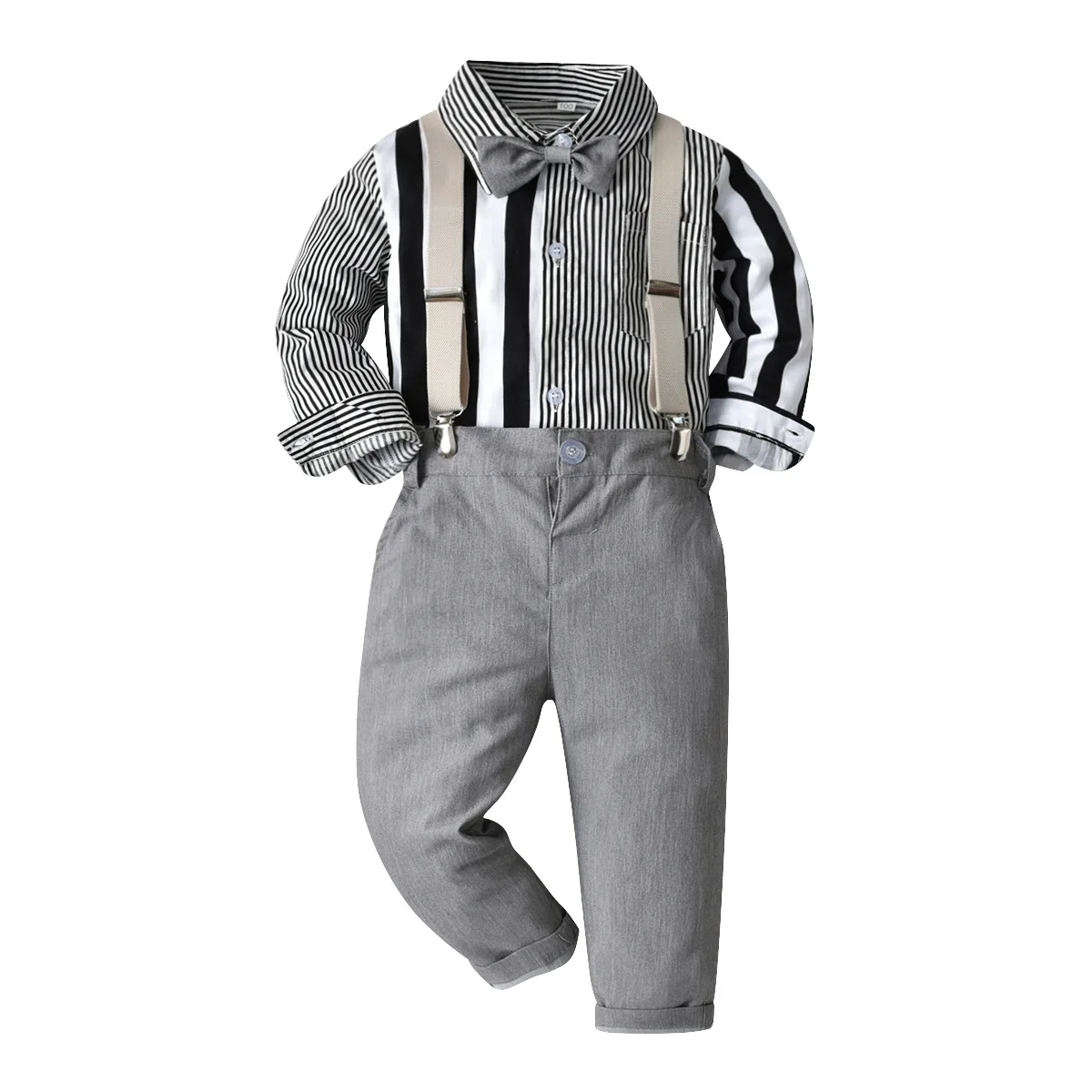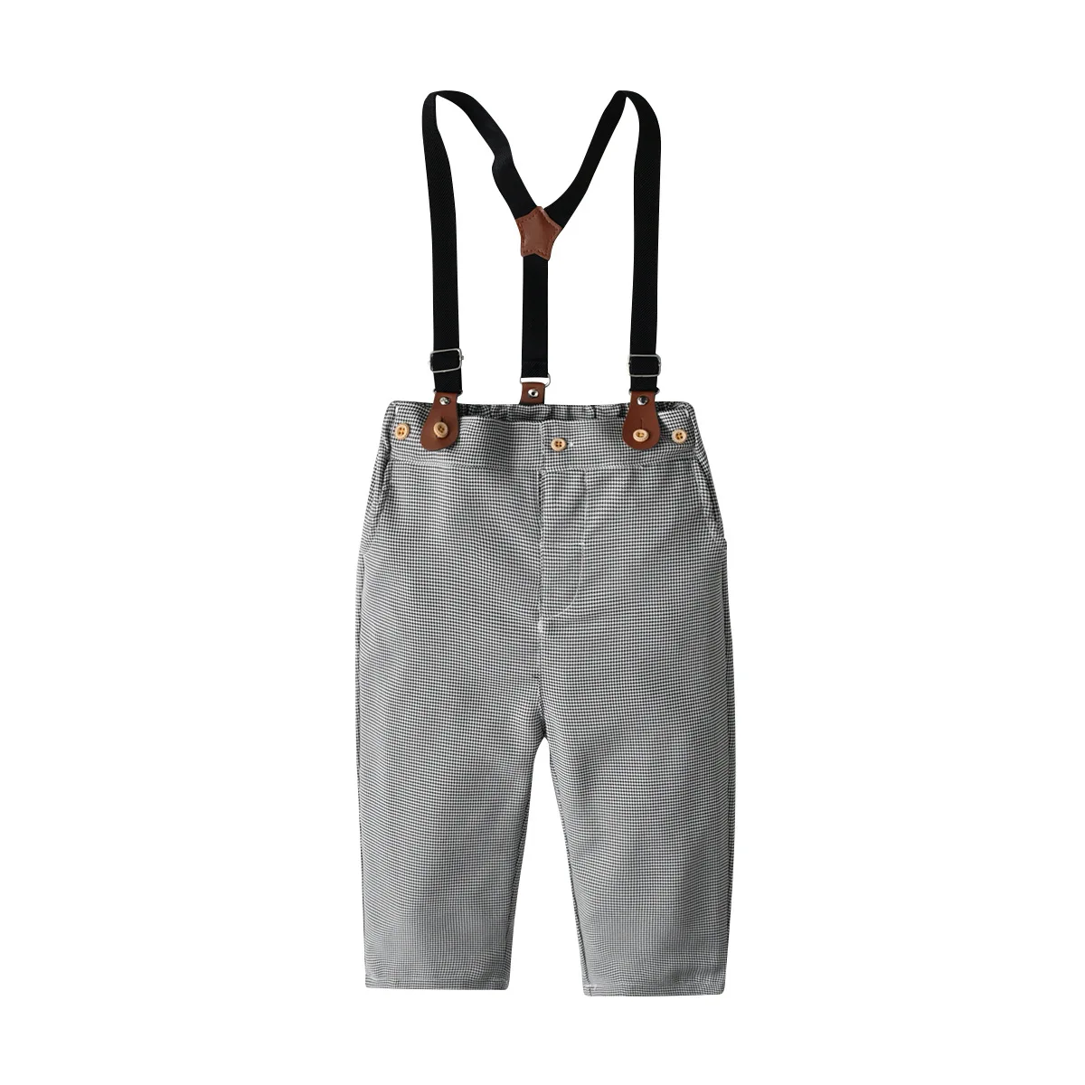 Модный детский джентльменский комплект одежды для мальчиков, хлопковая рубашка с длинным рукавом и бантом + брюки на бретелях, рождественские праздничные повседневные комплекты для мальчиков