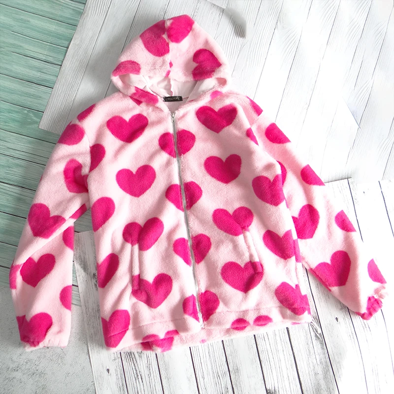 Кавайная розовая Женская флисовая куртка в форме сердца, теплая зим...
