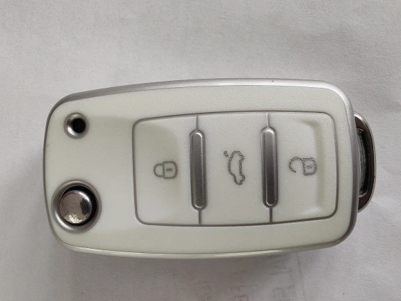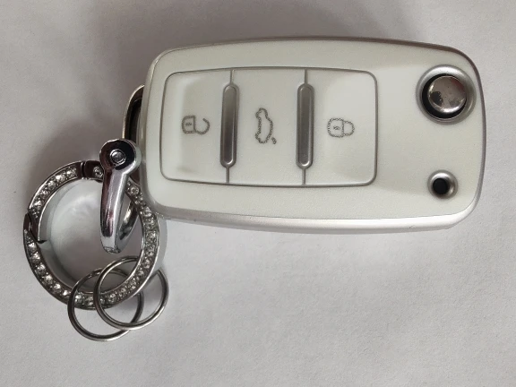 Это жесткий ТПУ с матовой отделкой. Он очень хорошо вписывается в ключ от Passat, а кольцо для ключей легко надеть с помощью винта, который регулирует его. Он поставляется с двумя другими кольцами, чтобы поставить другой ключ, я полагаю. Это очень мило.