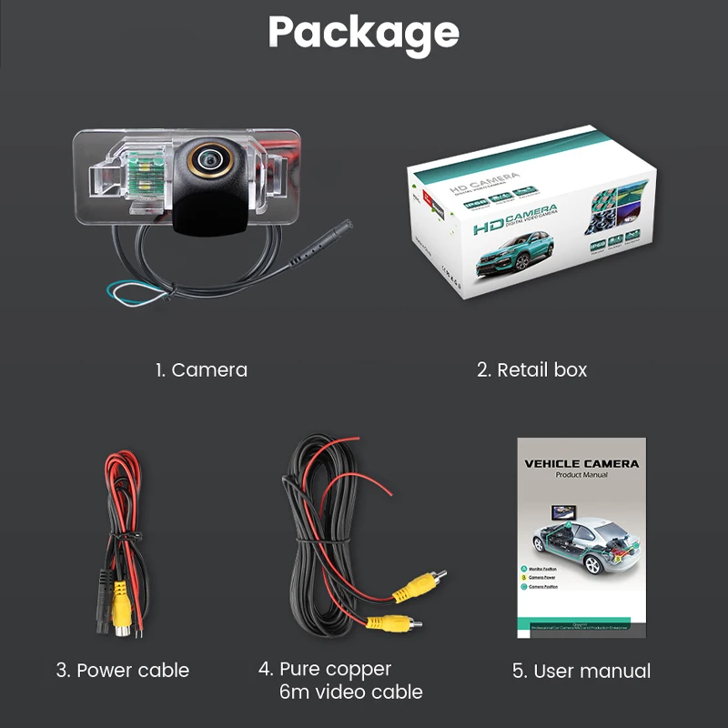 1. Камера заднего вида2. Розничная коробка3. Кабель питания4. Чистый медный 6 м видео кабель5. Руководство пользователя