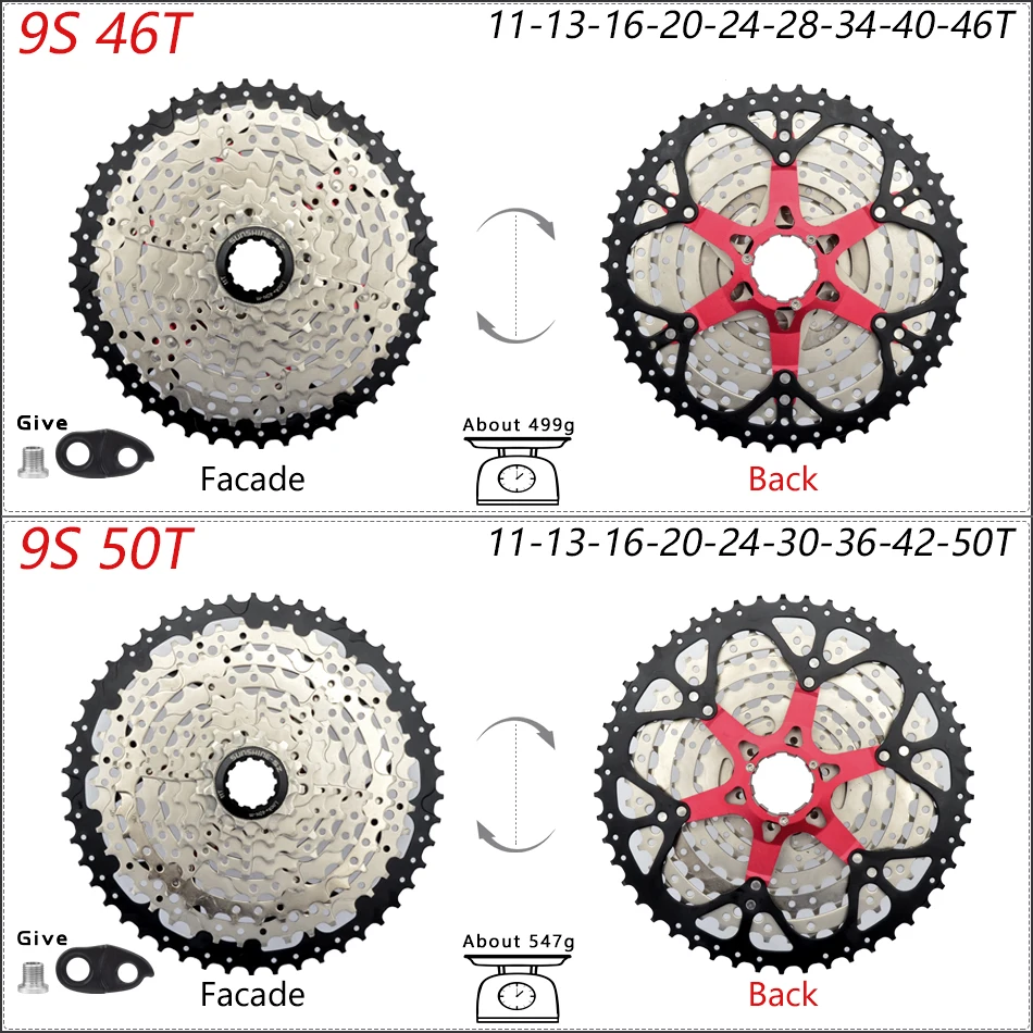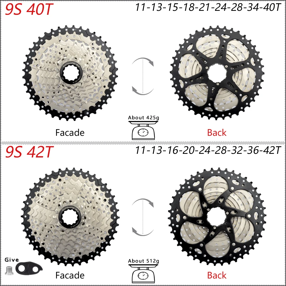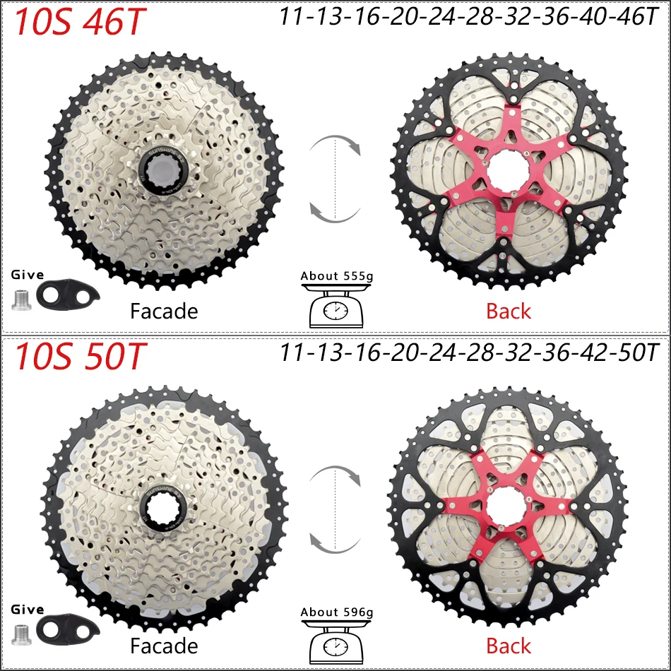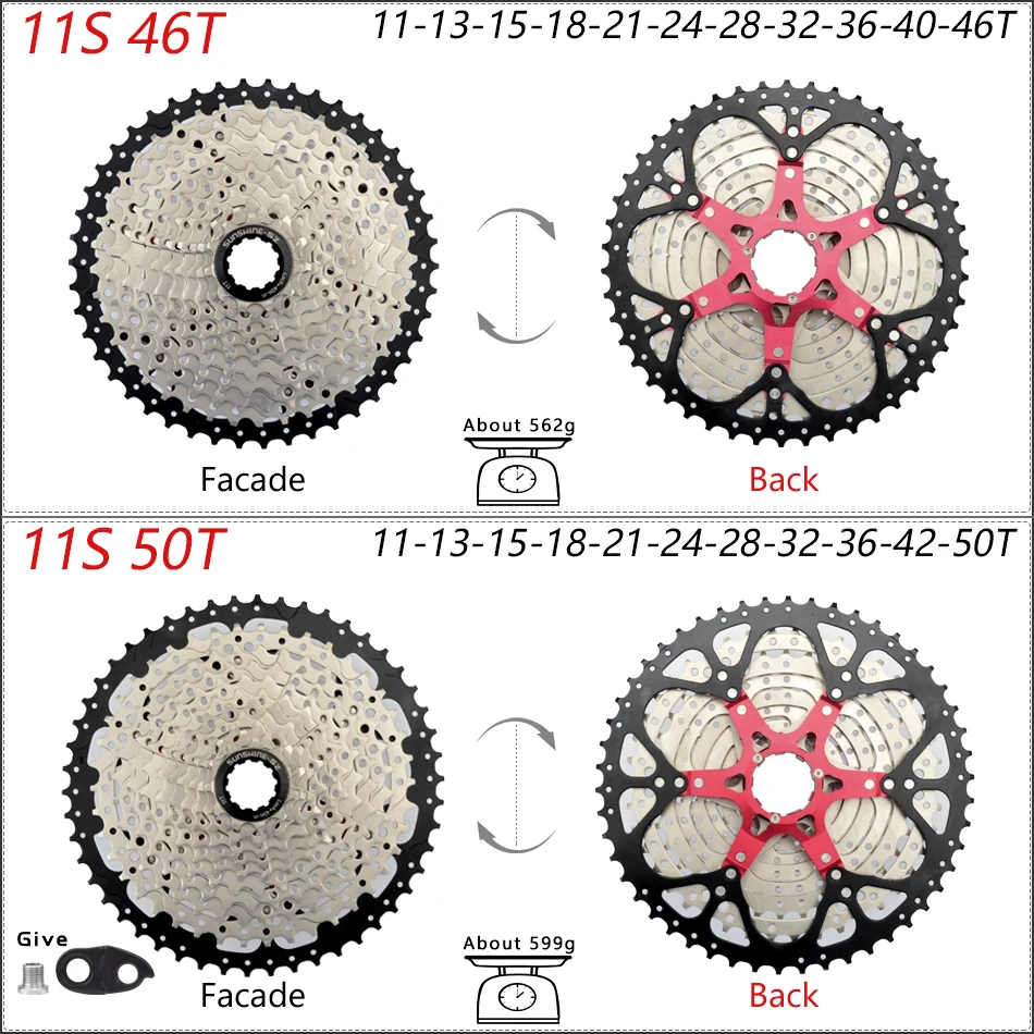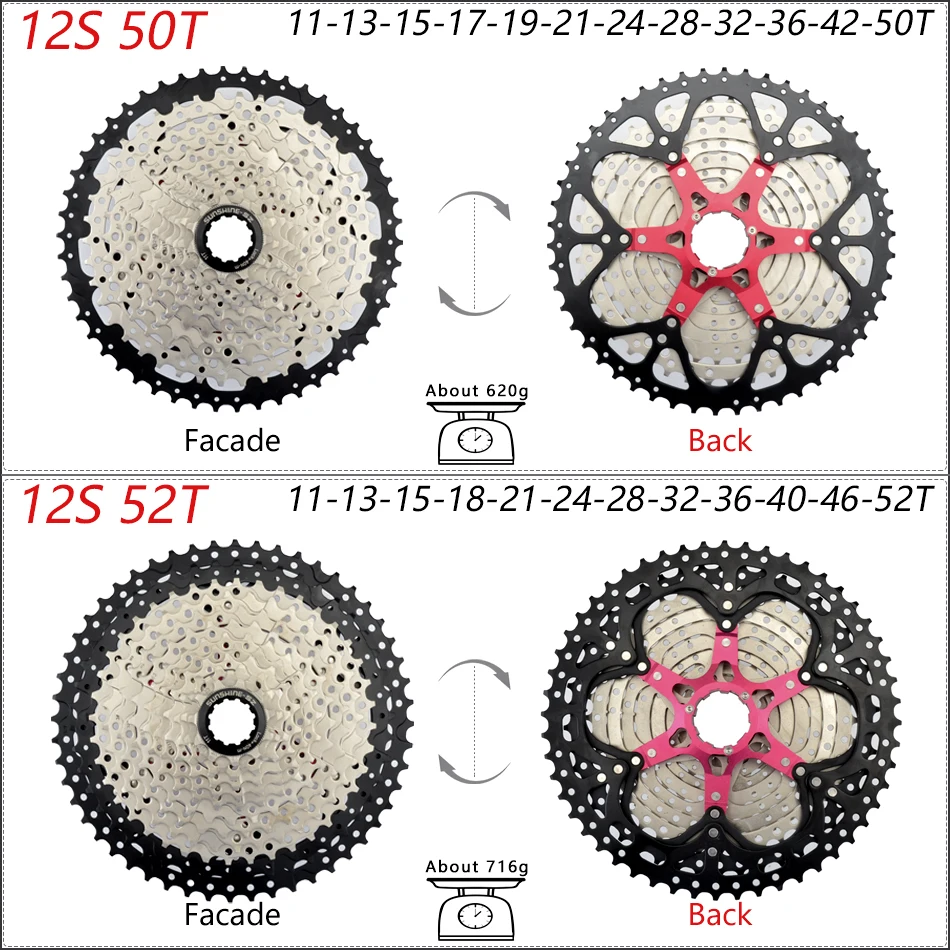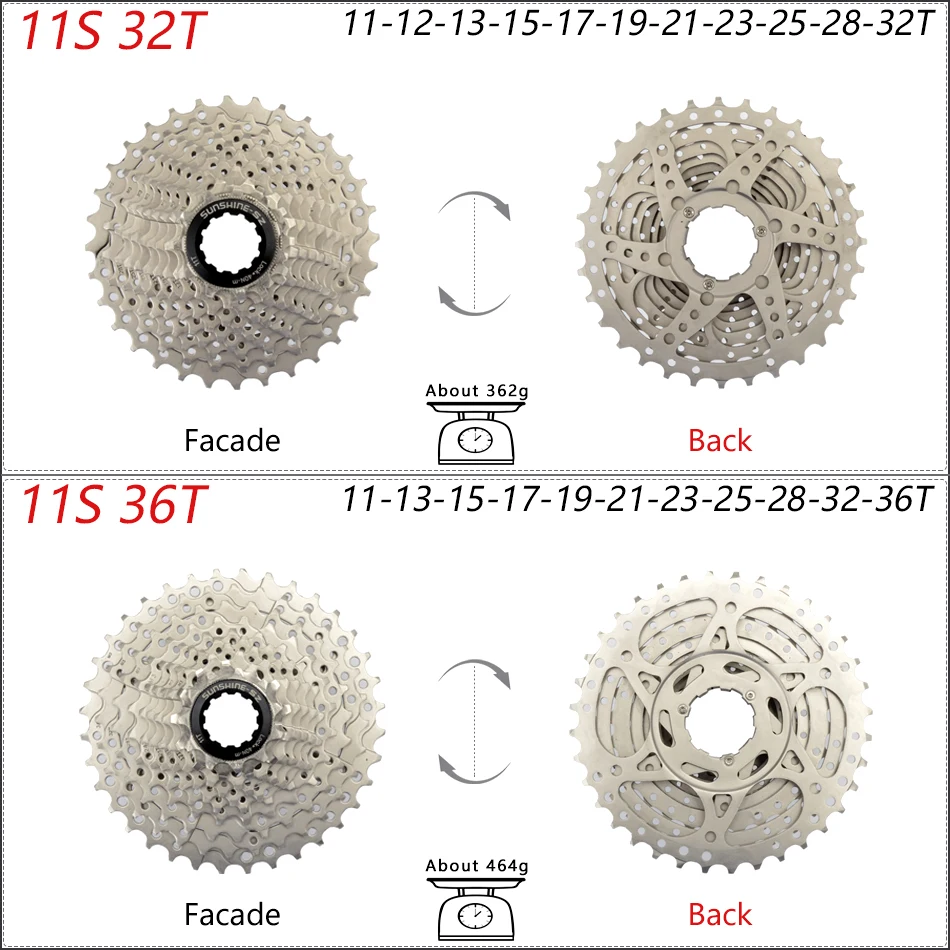 8S: 11-32T / 11-36T / 11-40T / 11-42T / 11-46T9S: 11-32T / 11-36T / 11-40T / 11-42T / 11-46T / 11-50T10S: 11-36T / 11-40T / 11-42T / 11- 46T / 11-50T11S: 11-40T / 11-42T / 11-46T / 11-50T / 11-52T12S: 11-46T / 11-50T / 11-52T