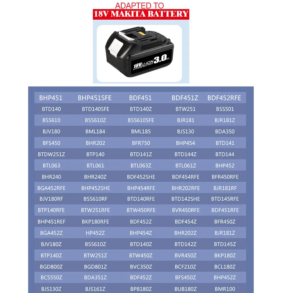Модель: самая последняя и безопасная аккумуляторная батарея BL1860B для электроинструментов MakitaНоминальное напряжение: 18 вНоминальная емкость: 3000 мАчТип батареи: литий-ионный