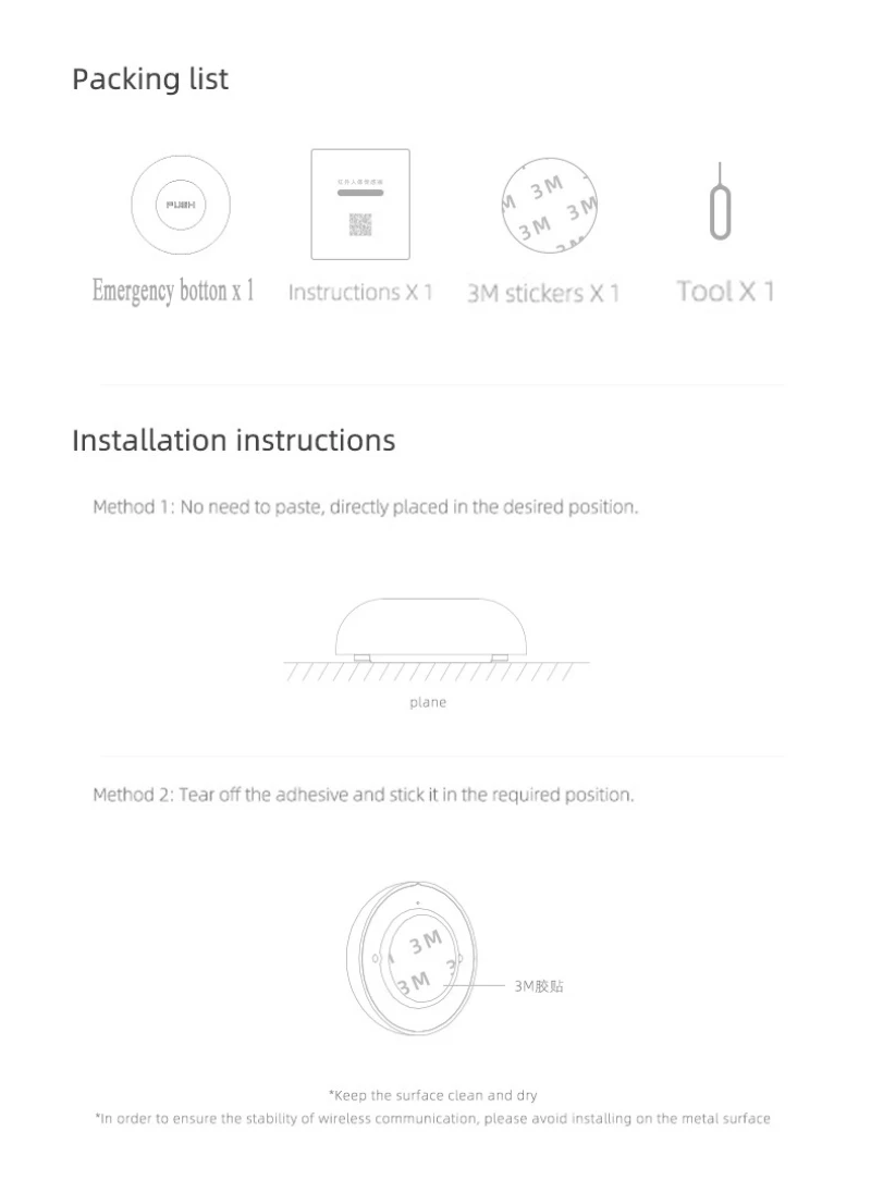 Аварийная кнопка * 1 руководство * 1 клейкая наклейка * 1 булавка * 1