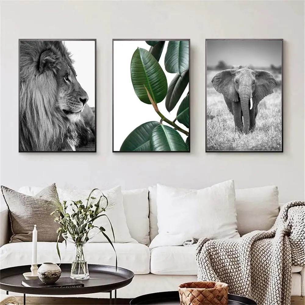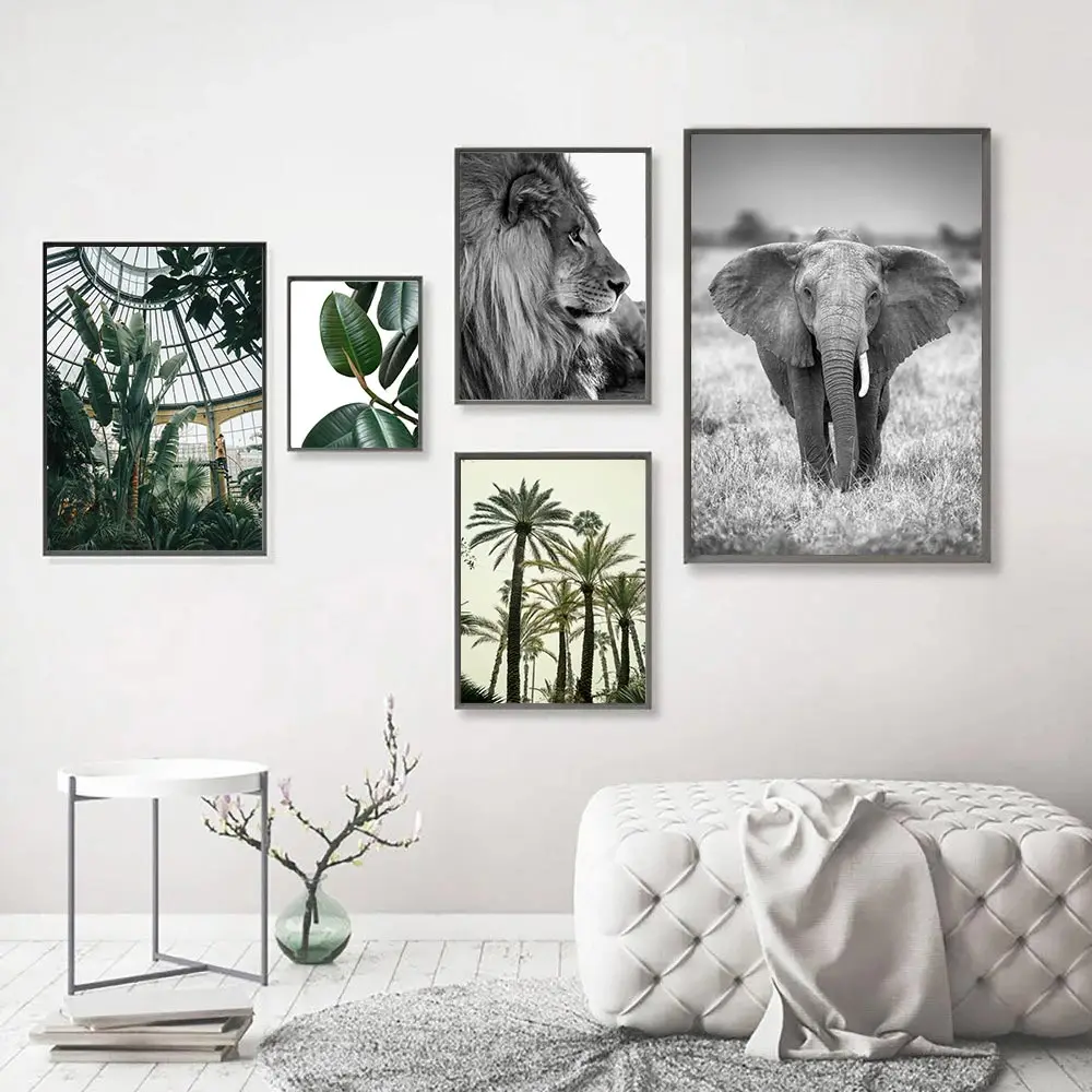 Настенный постер с зелеными листьями в скандинавском стиле, рисунок льва, слона, животных, Тропическое дерево, растение, холст, пейзаж, украшение для гостиной