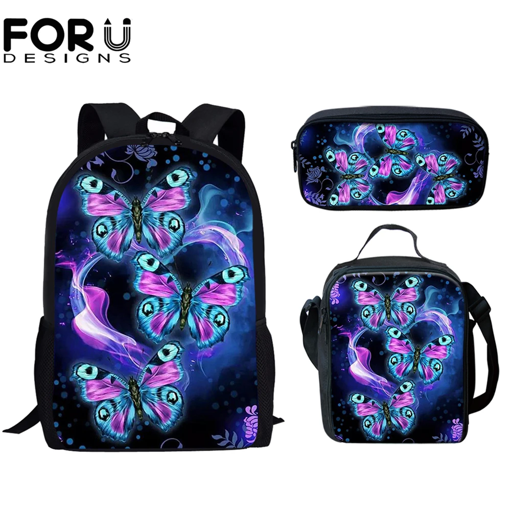 Комплект школьных сумок для девочек FORUDESIGNS из 3 предметов, вместительные Детские рюкзаки фиолетового и синего цветов с принтом бабочки