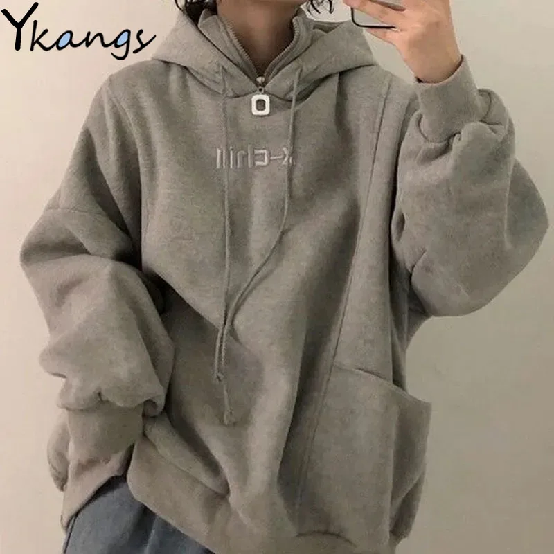 Свободный пуловер с высоким воротником и капюшоном на молнии Y2k, Женская универсальная блузка с вышивкой надписью, уличный женский спортивный топ с длинными рукавами для отдыха