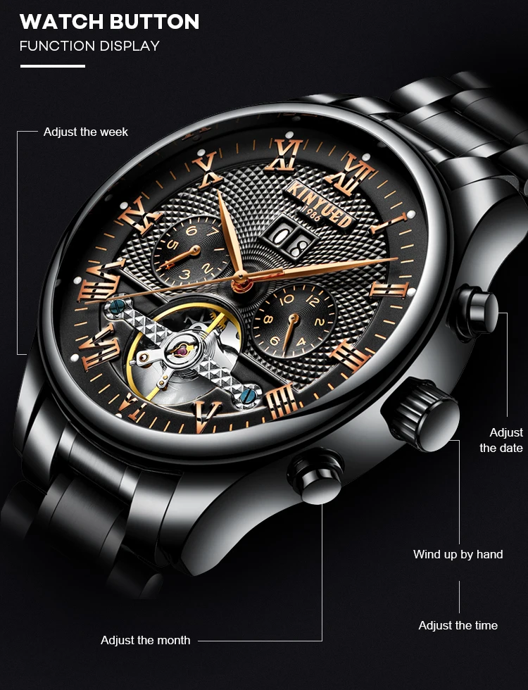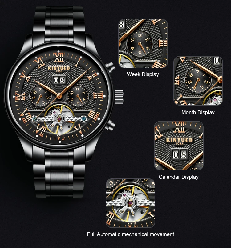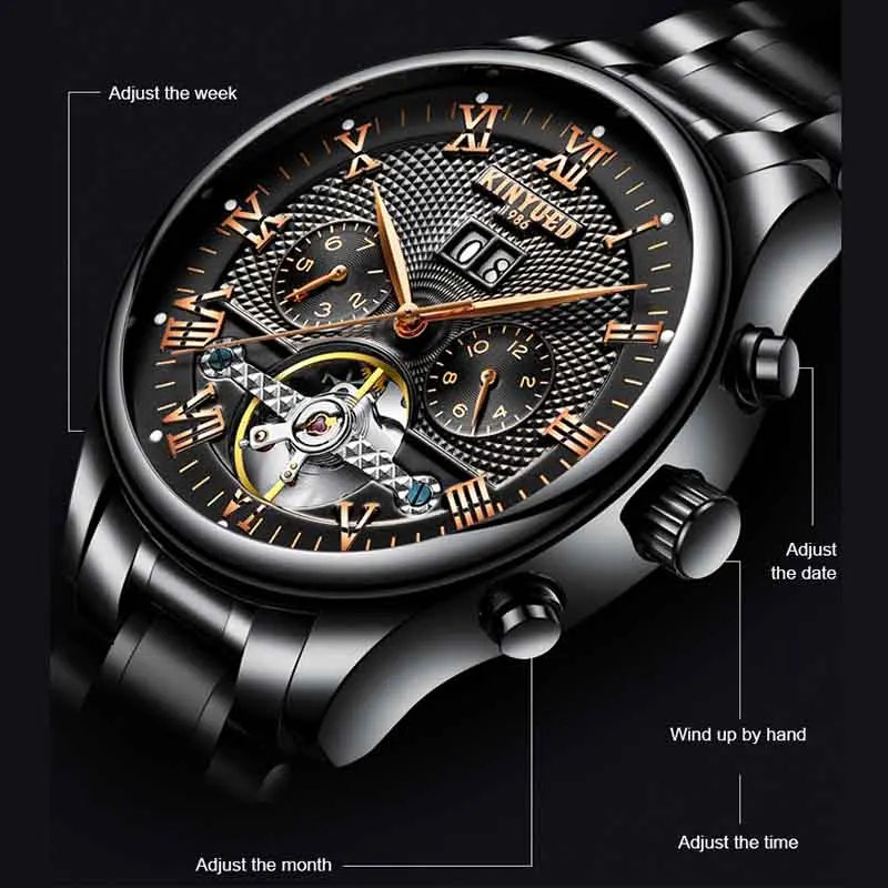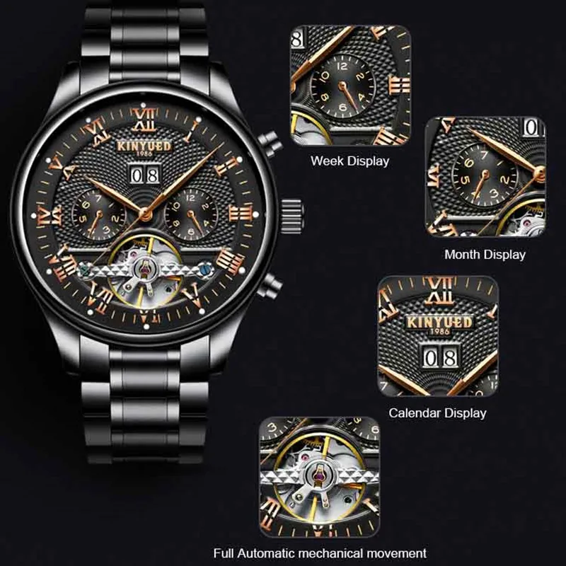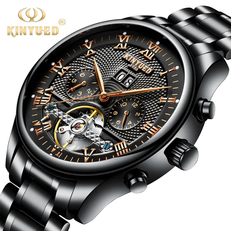 Часы-скелетоны KINYUED Мужские механические, люксовые автоматические водонепроницаемые Классические наручные, с календарем, отображением недели