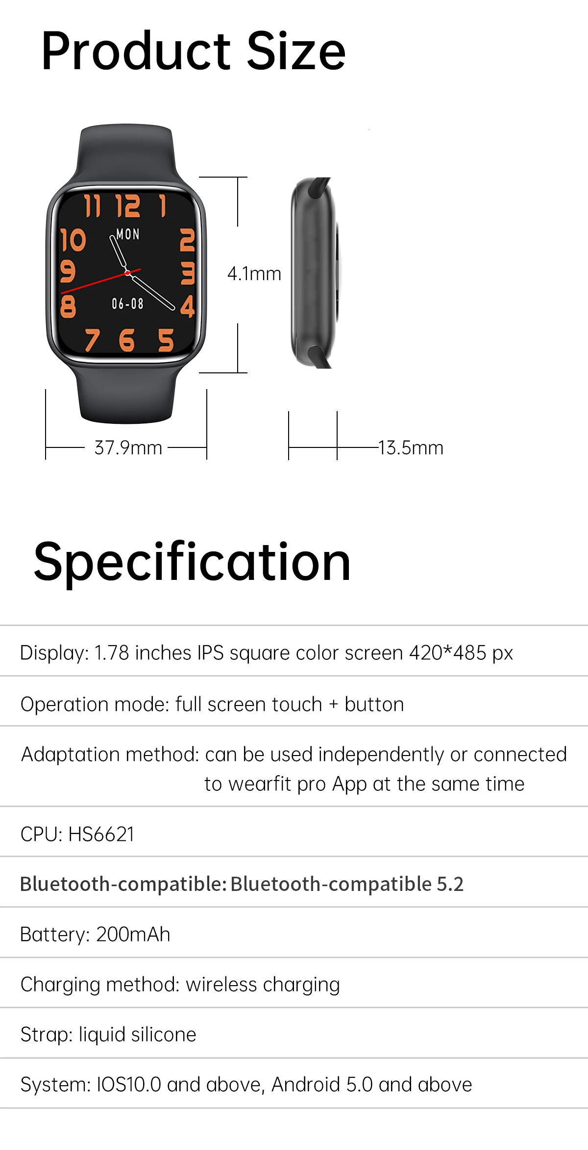1. Модель: HW22 Promax2. Размеры: 37,9*44,1*13,5 мм3. Материал корпуса: цинковый сплав4. Материал ремешка: силикон5. Экран: квадратный TFT экран6. Размер экрана: 1,78 дюйма7. Разрешение: 420*4858. Чип: Hs66219. Датчик сердца: SC7R3010. Память: 128 м11. Bt-совместимость: 5,212. Емкость аккумулятора: 200 мА · ч13. Способ зарядки: Беспроводная зарядка14. Срок службы батареи: 10 дней15. Время в режиме ожидания: 65 дней16. Класс водонепроницаемости: IP6717. Приложение: WearFit pro18. Системные требования: Android5.0 + / IOS10.0 +