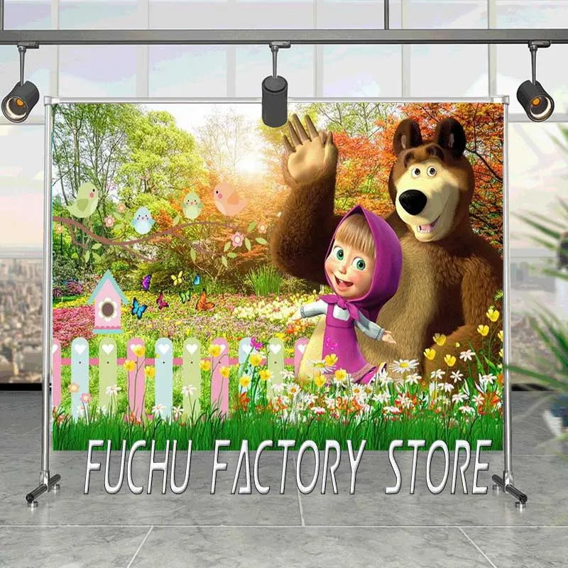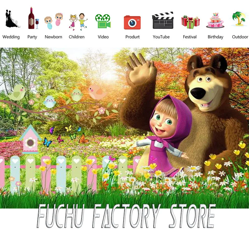 Счастливая девушка и медведь Весенний сад мультфильм фон девушка день рождения украшение фотостудия 3d цифровой Фон Ткань