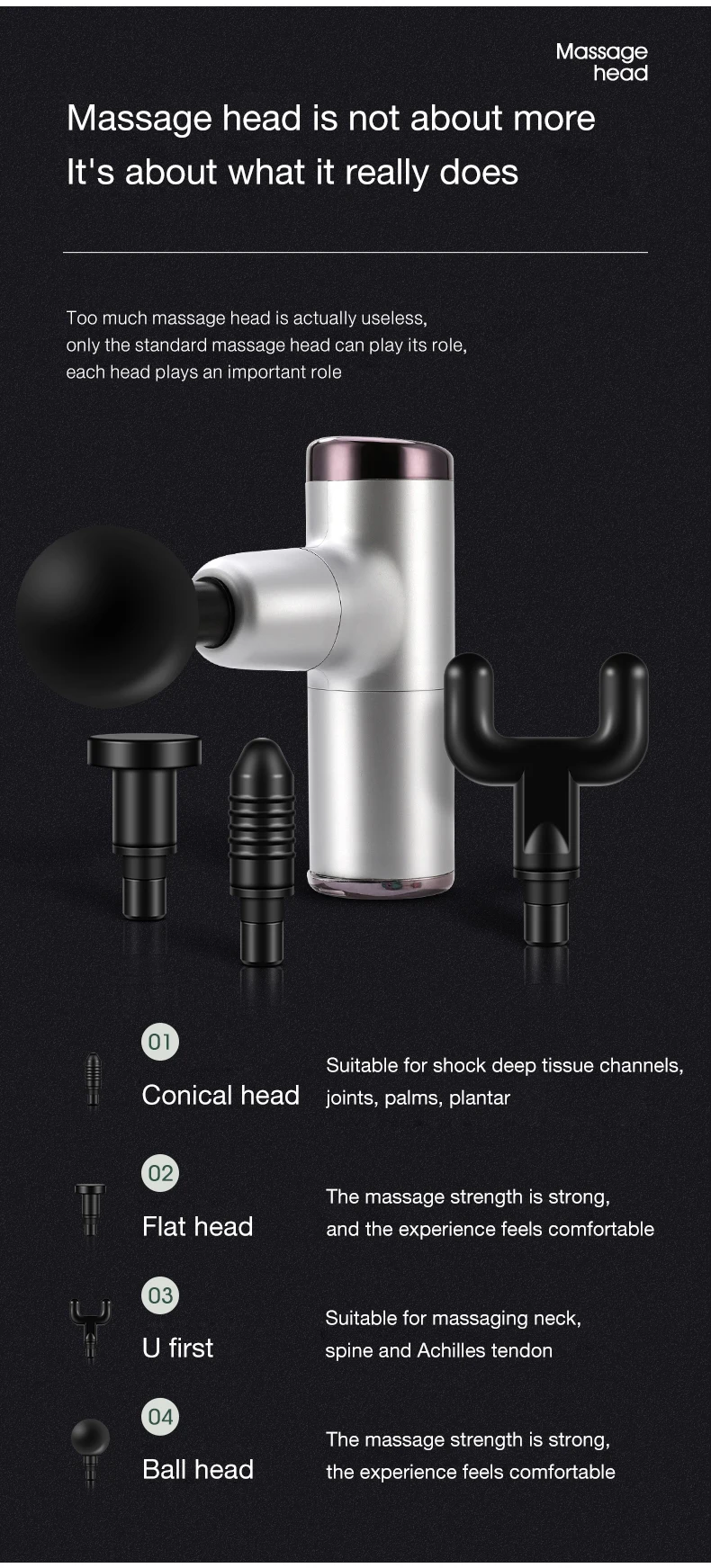 Массажный пистолет, Миниатюрный карманный массажер, для снятия боли в мышцах, расслабления, фитнеса, похудения, формирования, 4 массажных насадки
