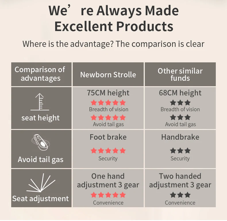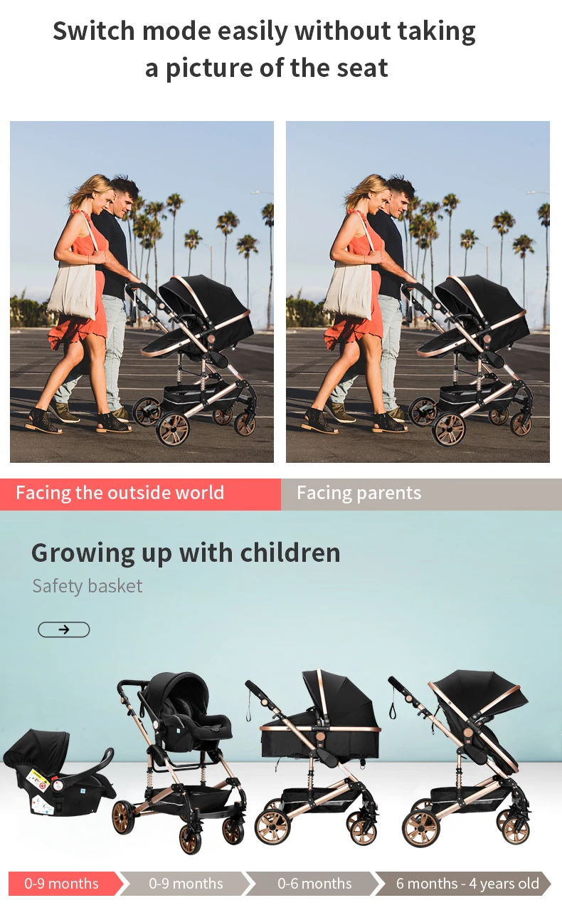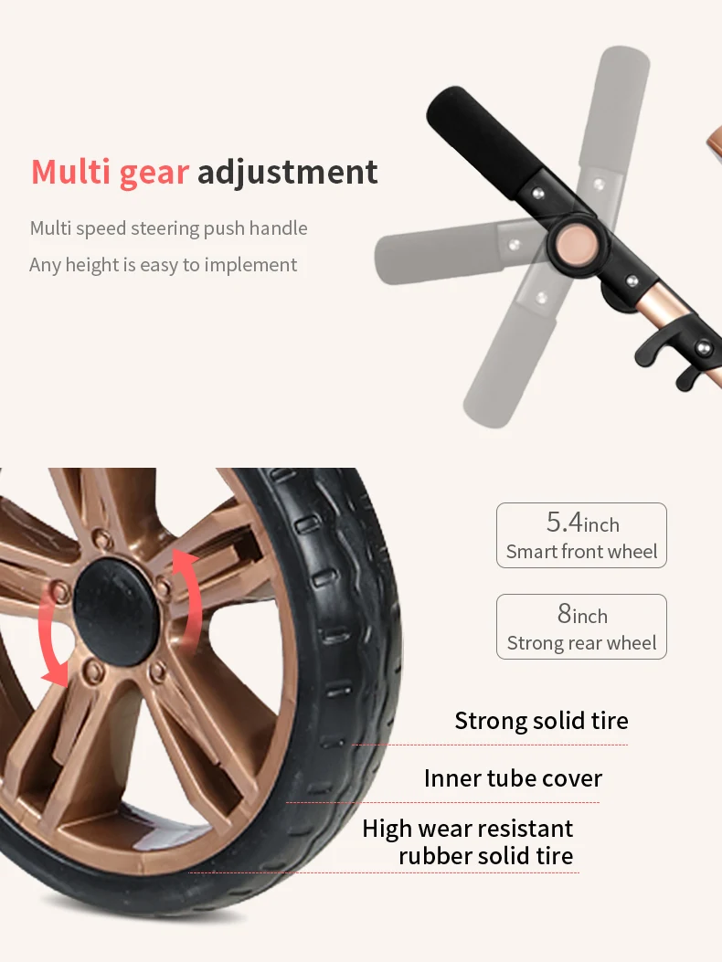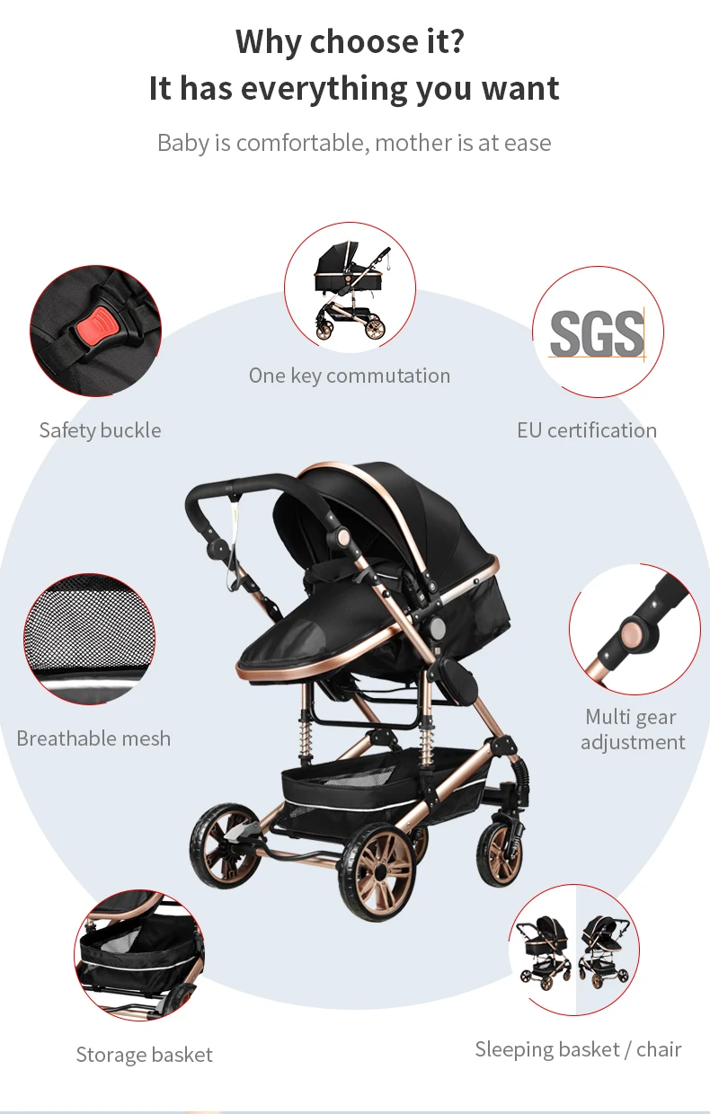The baby stroller has many functions. baby can sit or lie down. There is also a safety seat, which can be adjusted in many places. The wheels are also very easy to use. It is my ideal baby stroller.