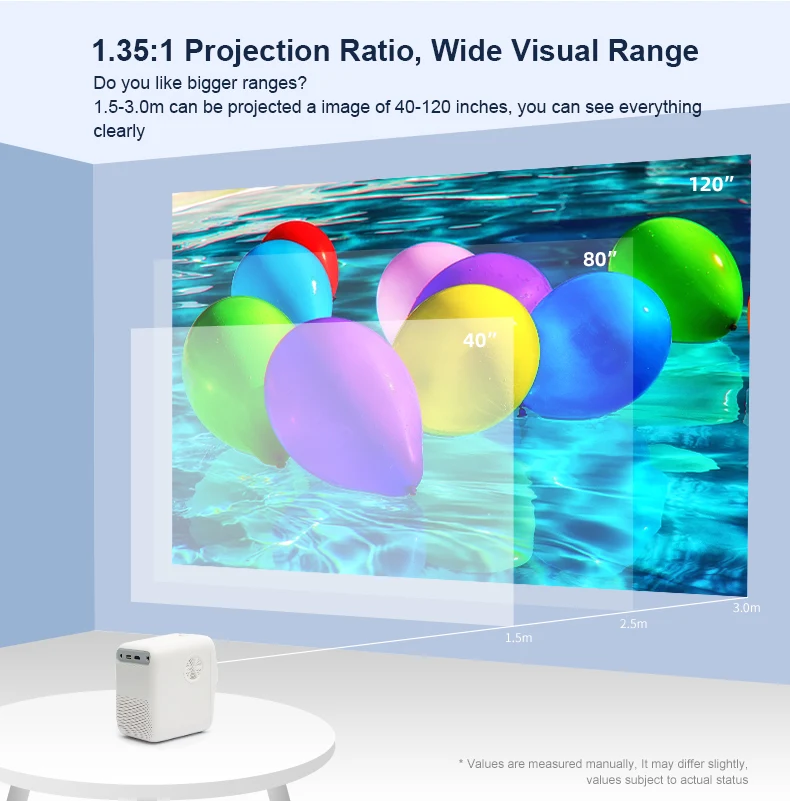 1. Характеристики: отношение проекции: 1,35: 1 Диапазон проекционного размера: 40-120 дюймов, рекомендуемый размер проекции 50-80 дюймов. Этот раздел поддерживает только Локальное воспроизведение U диска. Подключение Wi-Fi не поддерживается.