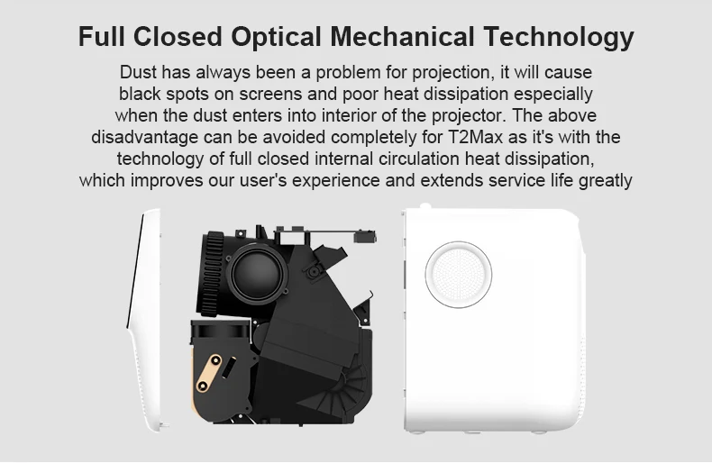 4. Оптомеханические технологии: T2 принимает полностью закрытый внутренний циркуляционный тепловыделение технологии машины. Он может полностью устранить влияние траектории на светильник, а также продлить срок службы и улучшить пользовательский опыт.