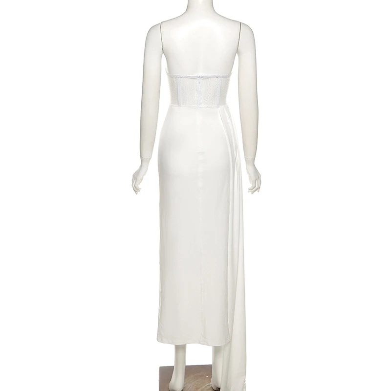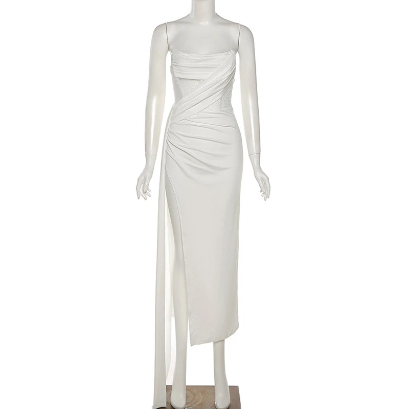 Длинное платье макси с блестками, без бретелек, с высоким разрезом