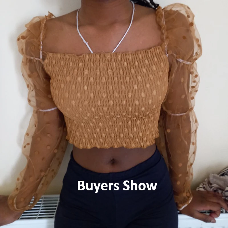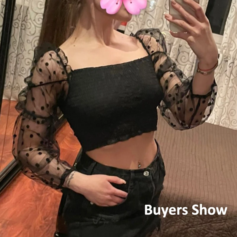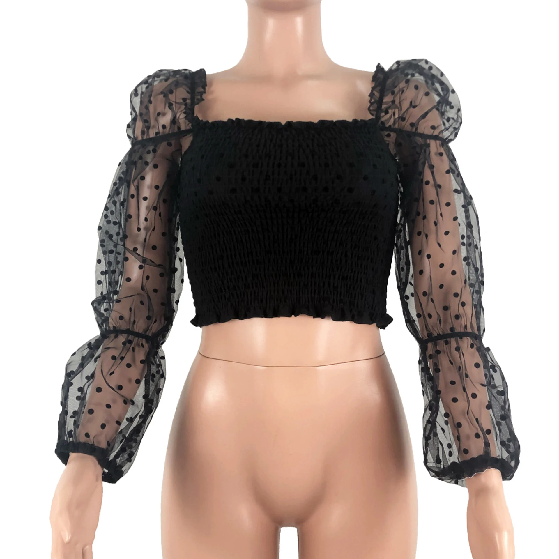 2021 US Женская сетчатая прозрачная блузка с пышными рукавами, винтажная рубашка в горошек, женская Свободная блузка