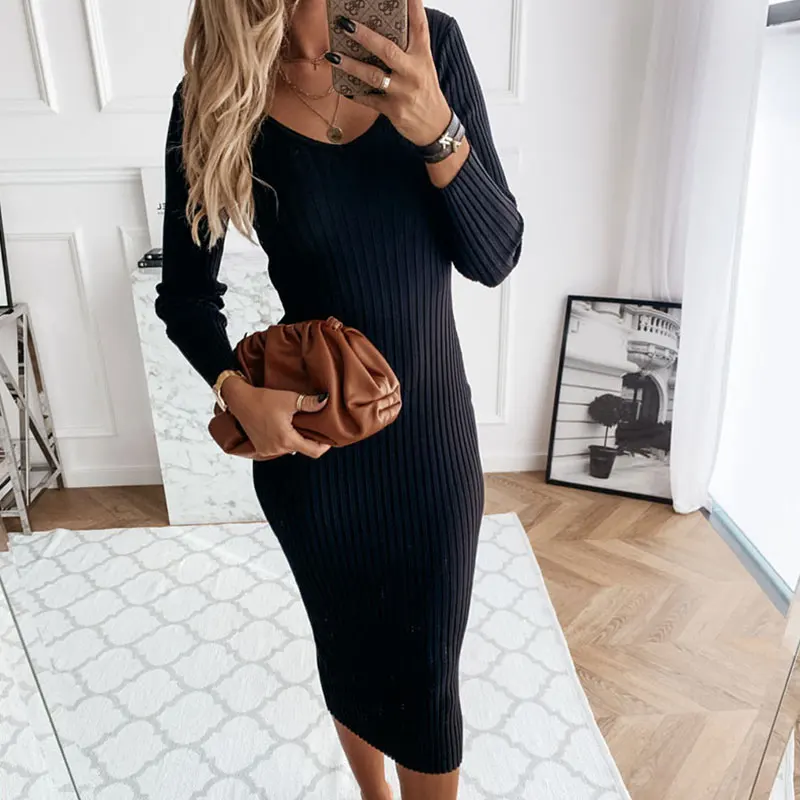 Осень 2021, вязаное платье с длинным рукавом и V-образным вырезом, вязаное платье, женские облегающие платья-свитеры, обычное облегающее платье, сексуальное женское платье