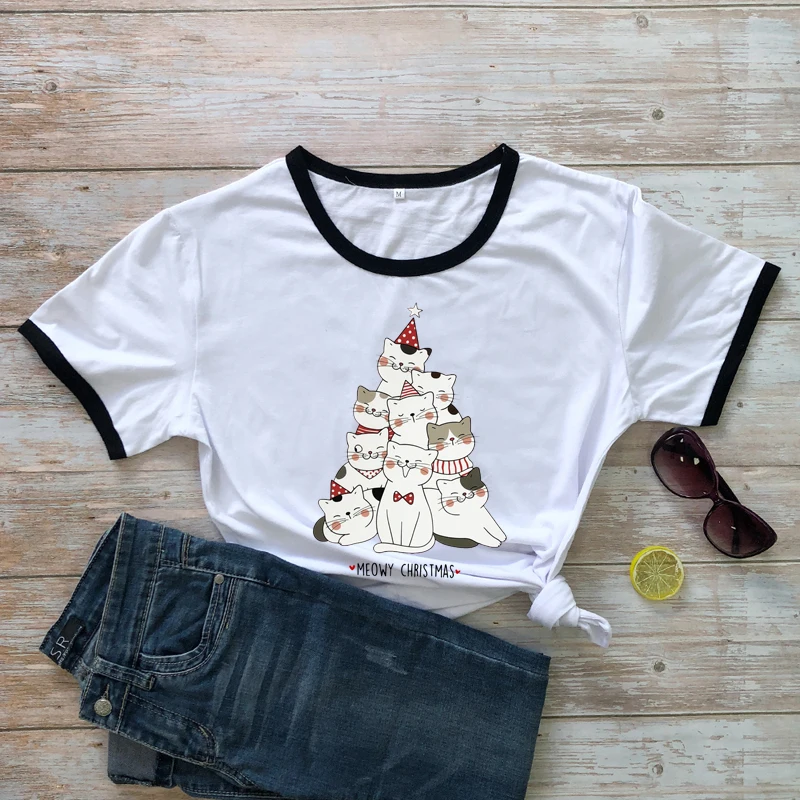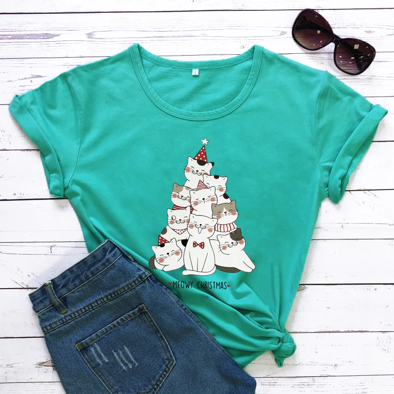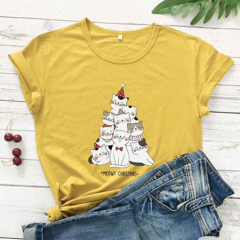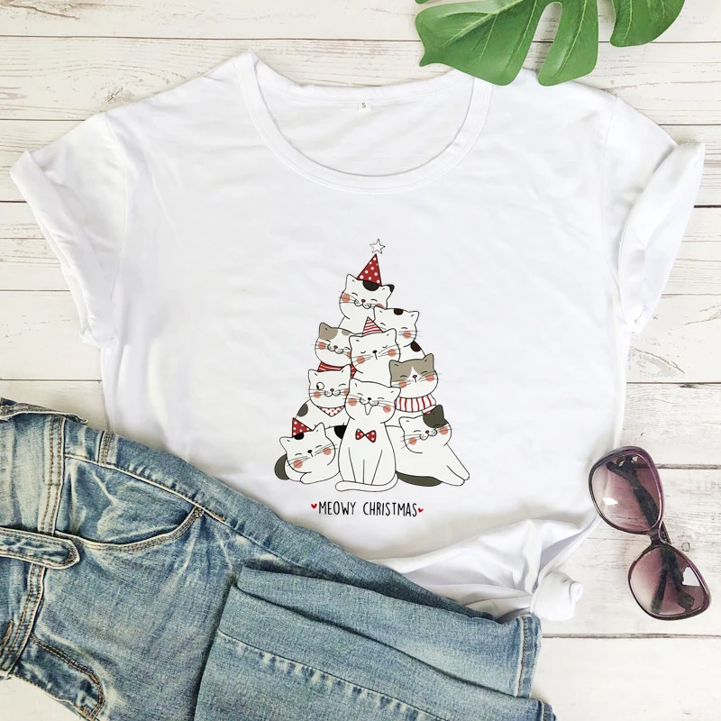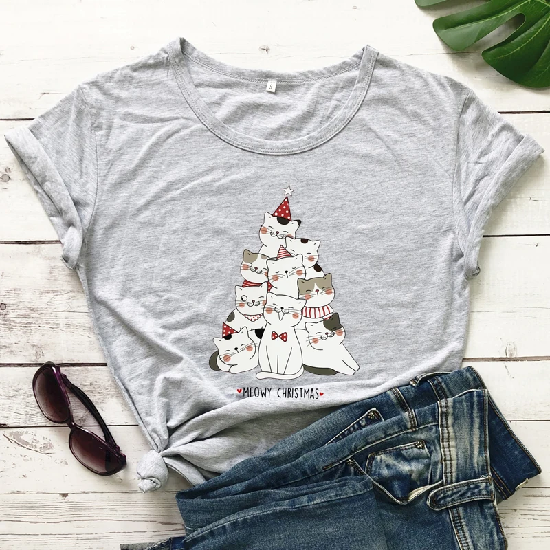 Зимняя Рождественская футболка из 100% хлопка с изображением милого кота и мамы, праздничная подарочная футболка, забавная футболка с изображением котенка и дерева, футболка, топ