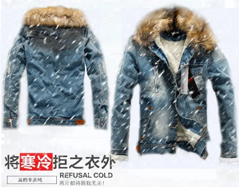Мужская джинсовая куртка с меховым воротником, Мужская рваная джинс...