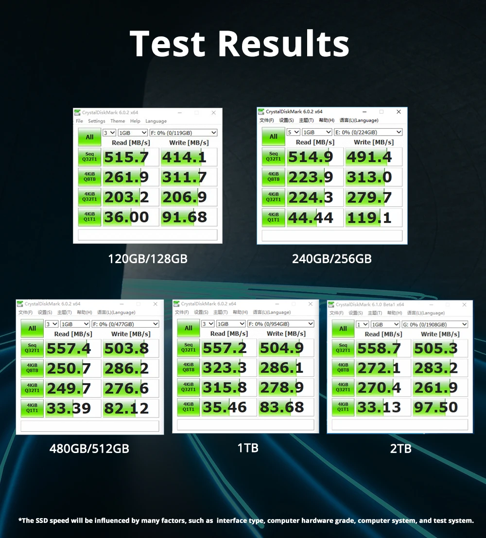 Производительность записи составляет 150 МБ/с./с, 30 МБ/с./с после заполнения около 1/3 диска, но это ожидается от NAND SSDs с технологией TLC. Это точка для рассмотрения при покупке. Производительность чтения очень хорошая.