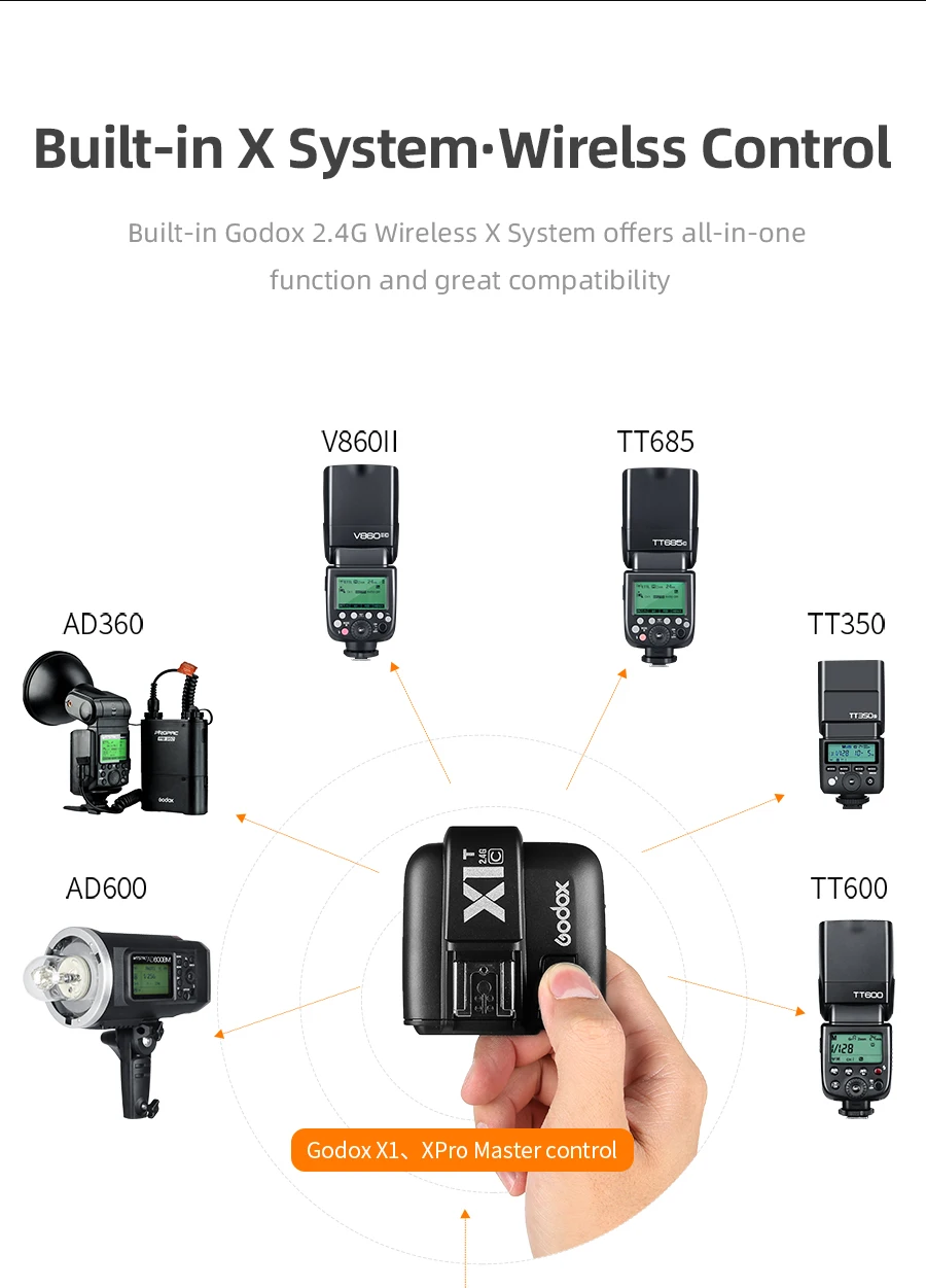 Godox V1C литий-ионная вспышка с круглой головкойGodox V1 оснащен круглой головкой вспышки, чтобы предложить студийный мягкий и ровный светильник.С мощными функциями и большим количеством аксессуаров, он подходит для портретной, свадебной, события, путешествия фотографии, натюрморт фотографии и т. Д.Быстрый замок горячий башмакШирокий Угол регулировки от 0 ° до 330 ° по горизонтали и от-7 до 120 ° по вертикали, что повышает эффективность съемки при падении вспышки.Поддержка обновления прошивки USBСовместимость с однообъективной зеркальной камеры Canon EOS камер серии, полная поддержка Canon E-TTL II Автоматическая вспышка, ручная вспышка, 1/8000s Высокоскоростная синхронизация, FEC,FEB,FEL, высокая скорость синхронизации и т. д.Удобный дизайн, с магнитным портом для быстрой установки различных аксессуаров, например, AK-R1 комплект аксессуаров.Работает с Godox 2,4G беспроводным X системным передатчиком.Беспроводное управление и множество функцийВстроенная беспроводная система goodx 2,4G X предлагает функцию «все в одном» и отличную совместимость.Высокопроизводительный Panasonic Li-Ion Батарея. 7,2 V/2600 мА/ч, Батарея предлагает 1.5s время зарядки и 480 полная мощность выстрелаВстроенный светодиодный светильник для моделирования регулируется от 01 до 10 шаговОтличный светильник и может использоваться для включения или выключения камерыРаспределяющий ровный светильник от центра до края, обеспечивающий естественный и красивый светильник V1 круглый эффект вспышки более мягкий и ровный.Характеристики:Мощность (1/1 выход) :76WsПокрытие вспышки: от 28 до 105 ммПродолжительность вспышки: от 1/300 до 1/20000 секундБеспроводная вспышкаФункция беспроводной вспышки: master,Slave,offУправляемые Подчиненные группы: 4(A,B,C,D)Диапазон передачи (appros.):100 мКаналы: 32(1-32)ID:01-99Моделирующая вспышка: работает с кнопкой предварительного просмотра глубины камеры.Технические данные:Мощность (1/1 выход): 76WsПокрытие вспышки: от 28 до 105 мм-Автоматическое увеличение (покрытие вспышки автоматически устанавливается в соответствии с фокусным расстоянием объектива и размером изображения)-- Ручной зум-- Качающаяся/наклонная головка вспышки (Вспышка отскока): от 0 до 330 градусов по горизонтали и от-7 градусов до 120 градусов по вертикалиПродолжительность вспышки: от 1/300 до 1/20000 секундСветодиодный светильник: Мощность: 2 Вт, цветовая температура: 3300K +- 200KПосылка:1 * Вспышка Godox V11 * Аккумулятор1 * зарядное устройство1 * USB кабель для зарядки1 * защитный чехол1 * Руководство пользователя