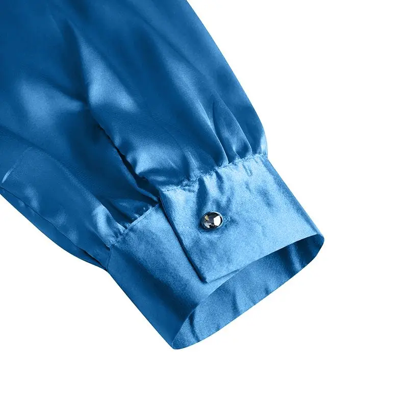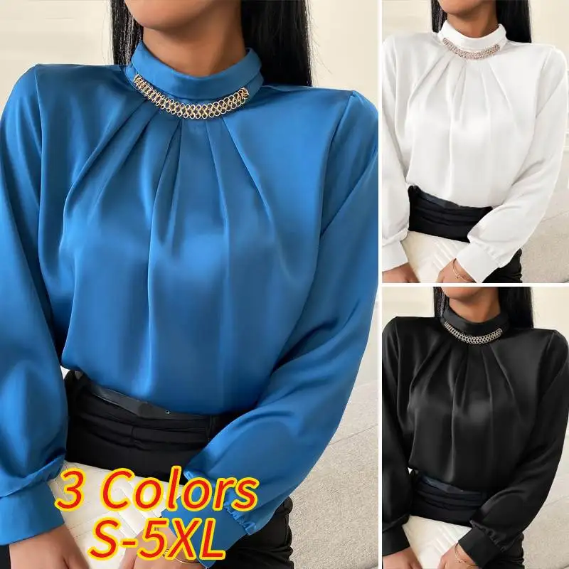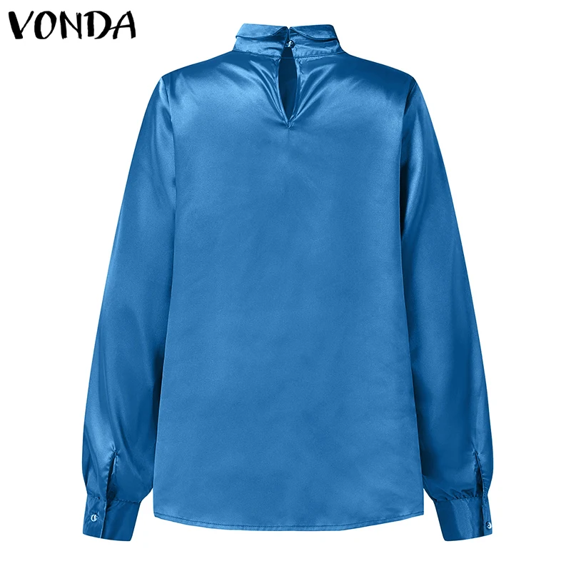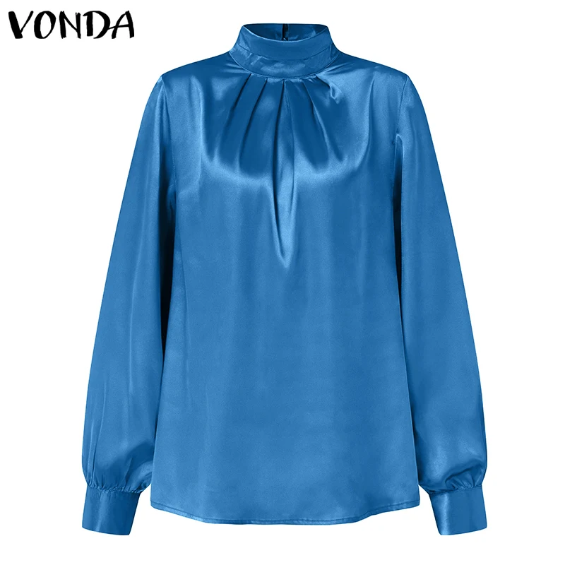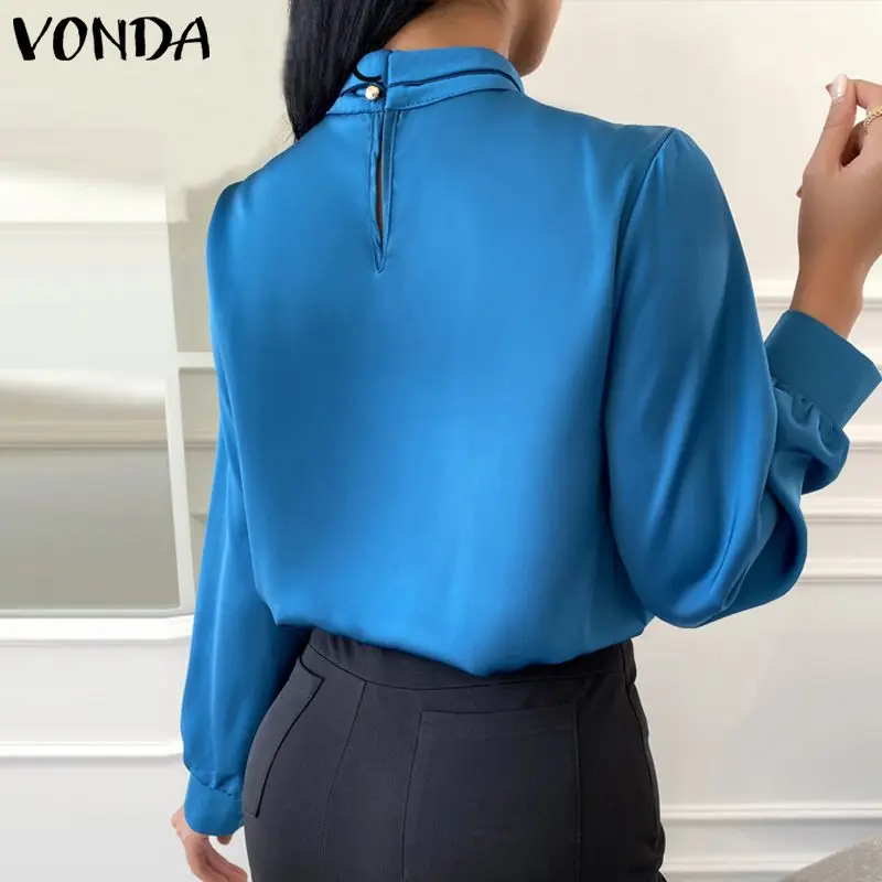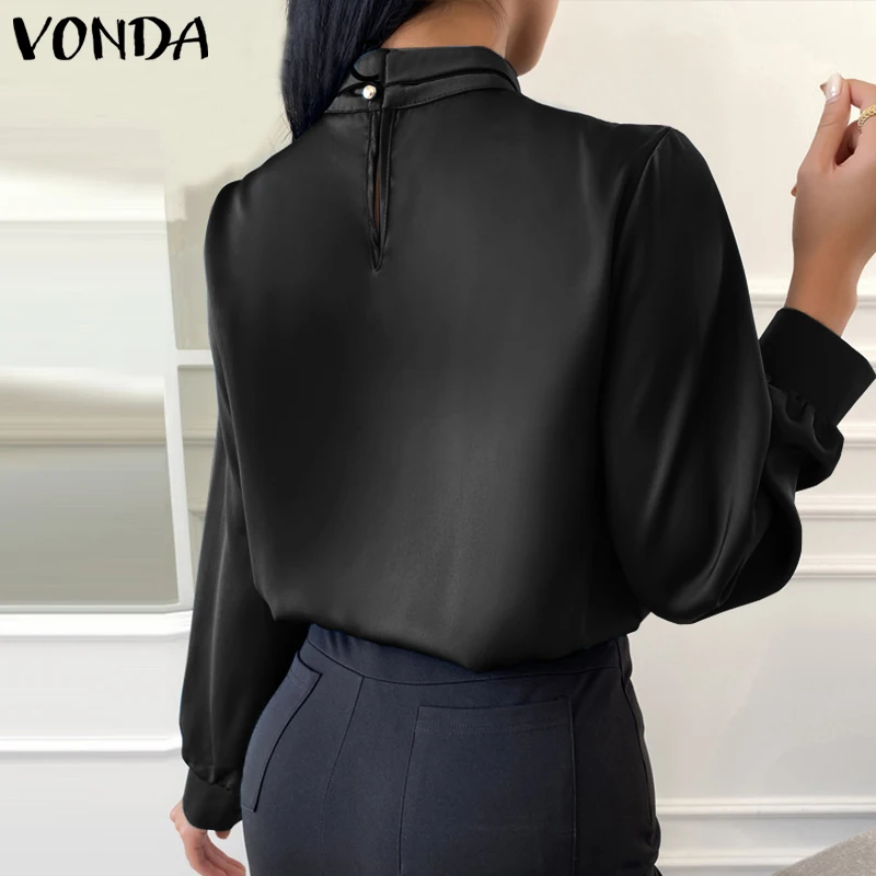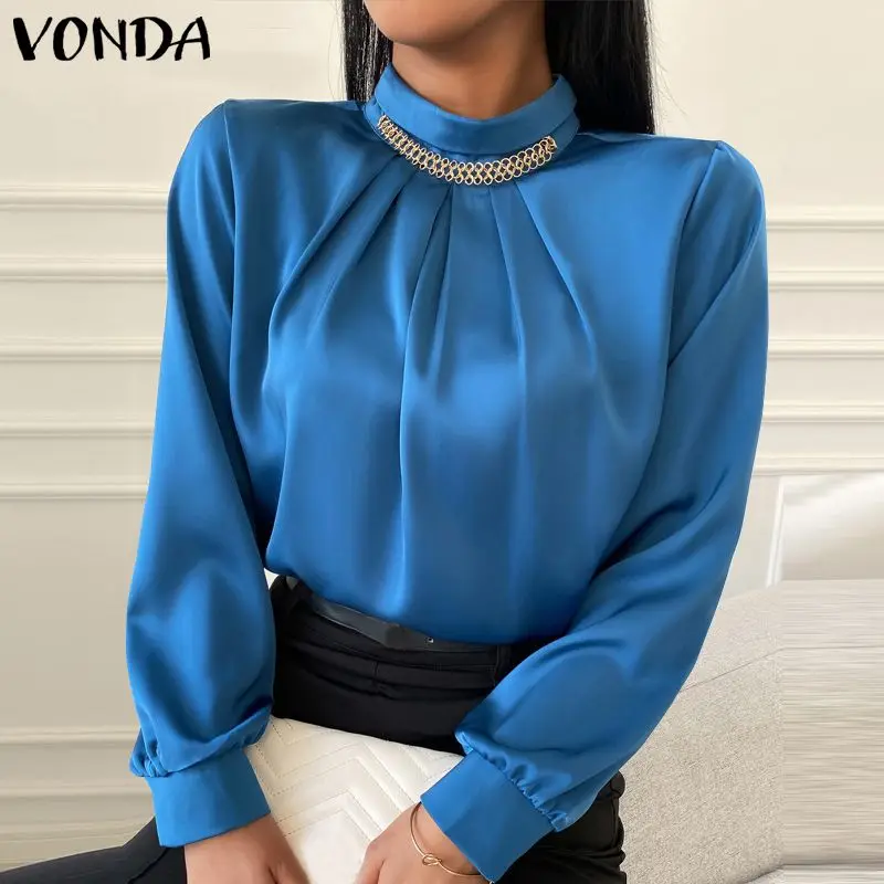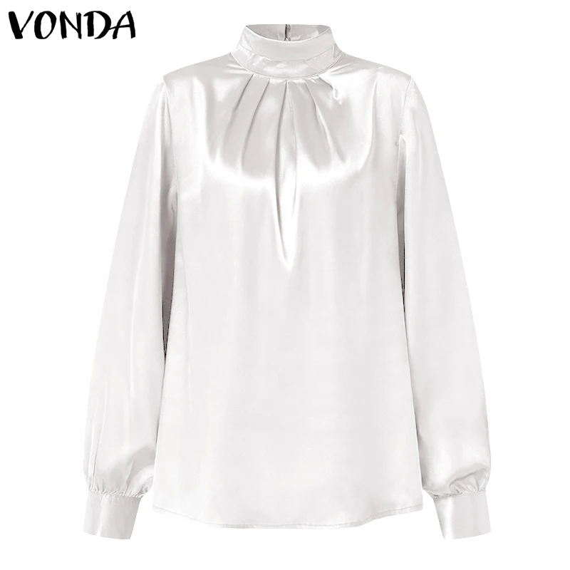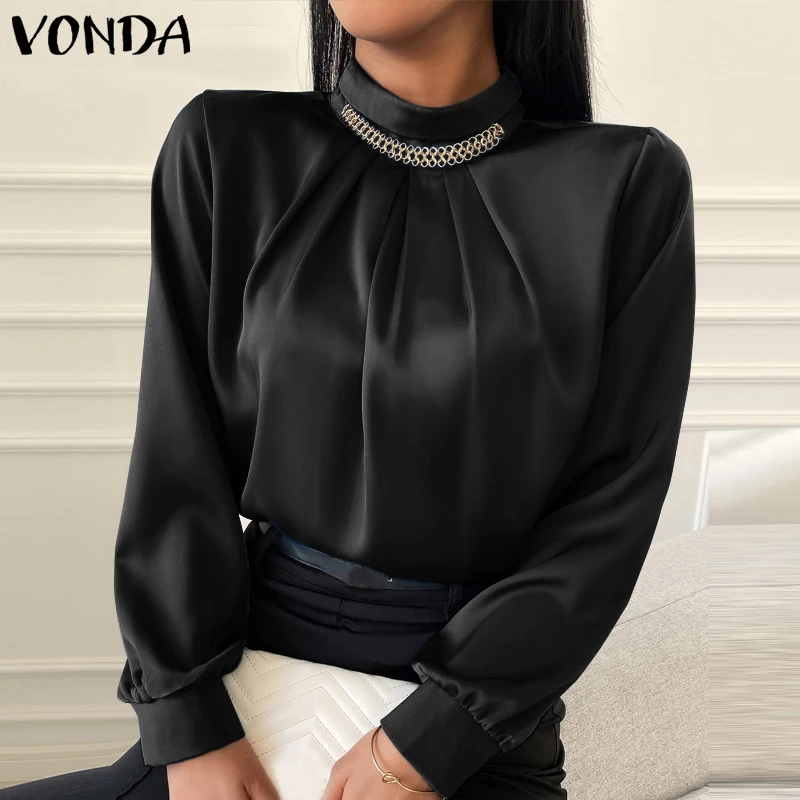 Модная атласная Женская блузка с длинным рукавом и ложным воротником, плиссированные топы VONDA 2021, Осенние повседневные однотонные богемные блузы, женская уличная одежда