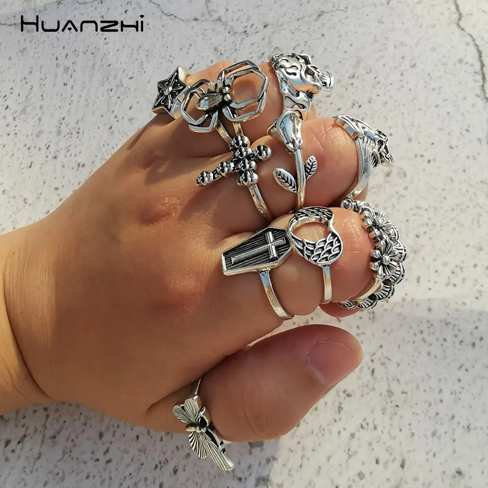 HUANZHI 2021 стильные новые искусственные кольца с ангелом в виде цветка для женщин в стиле хип-хоп увеличенные серебряные цвета