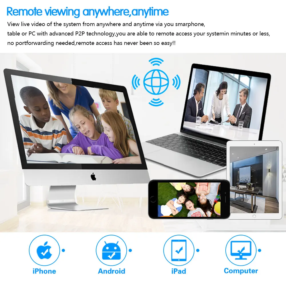 Простая настройка, всего 4 шага для просмотра мобильный телефон, просмотра видео в режиме реального времени из любого места и в любое время с помощью смартфона, стола или ПК с передовой технологией P2P, вы можете получить удаленный доступ к вашей системе за считанные минуты или меньше, нет необходимости в переадресации, удаленный доступ никогда не был таким простым!