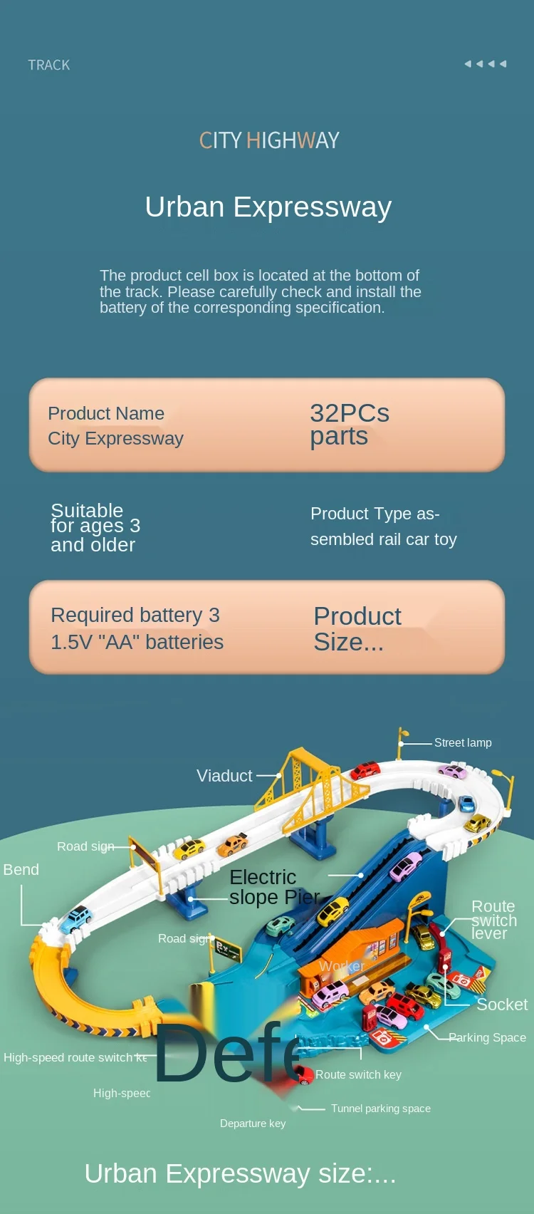 Название продукта: городская скоростная дорогаМатериал: пластикТип товара: сборные игрушки на рельсахПодходящий возраст: 3 года и выше