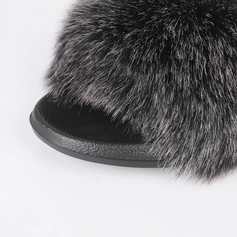 Women Summer Casual Fluffy SlippersWith Fur Flat Non-Slip Real Fox Fur Furry Slides