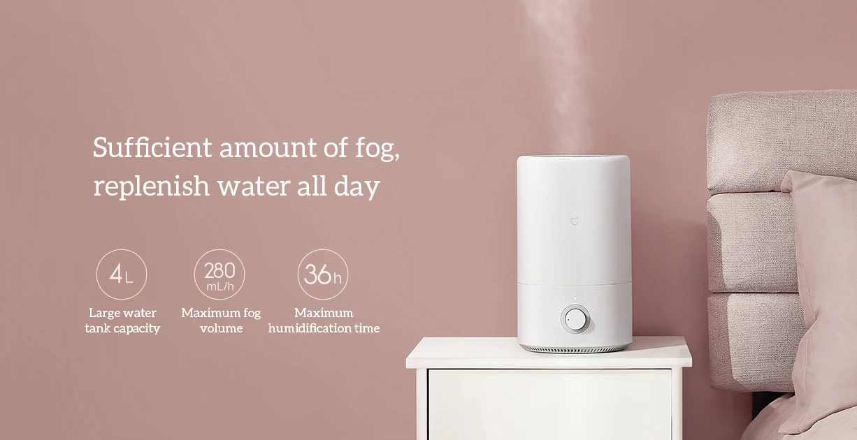 4L Большая Емкость резервуара для воды, эквивалент 16 бутылок 250 мл минеральной воды. 280 мл/ч прочность тумана *, 10 м2 спальня может быть увлажнена по крайней мере 9% * в течение одного часа, чтобы облегчить сушка быстрее. Самое длительное время увлажнения может достигать 36 часов без частого добавления воды.