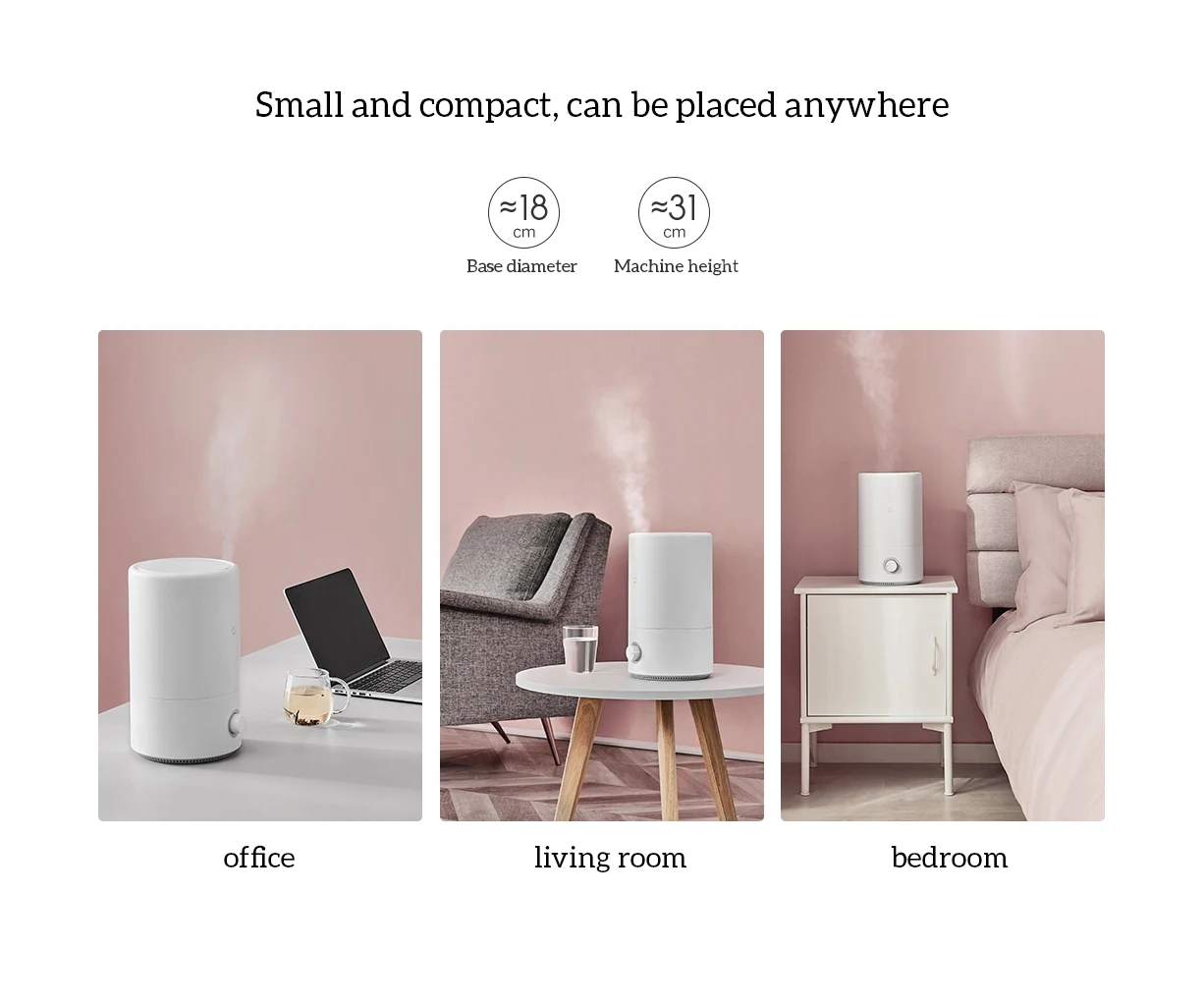 Диаметр верхней части увлажнителя Mijia составляет 14 см, открытый рот легко вытирается. Круглая и тонкая внутренняя структура уменьшает мертвый угол грязи и грязи. Резервуар для воды-это светильник, который легко переносить, что делает уборку более экономичной