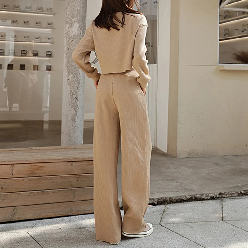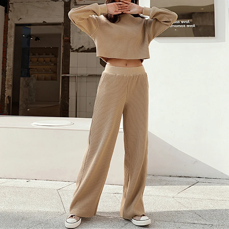 Женский трикотажный комплект из 2 предметов, Повседневный свитер с длинным рукавом и круглым вырезом и длинные брюки с широкими штанинами и высокой талией, Осень-зима 2021