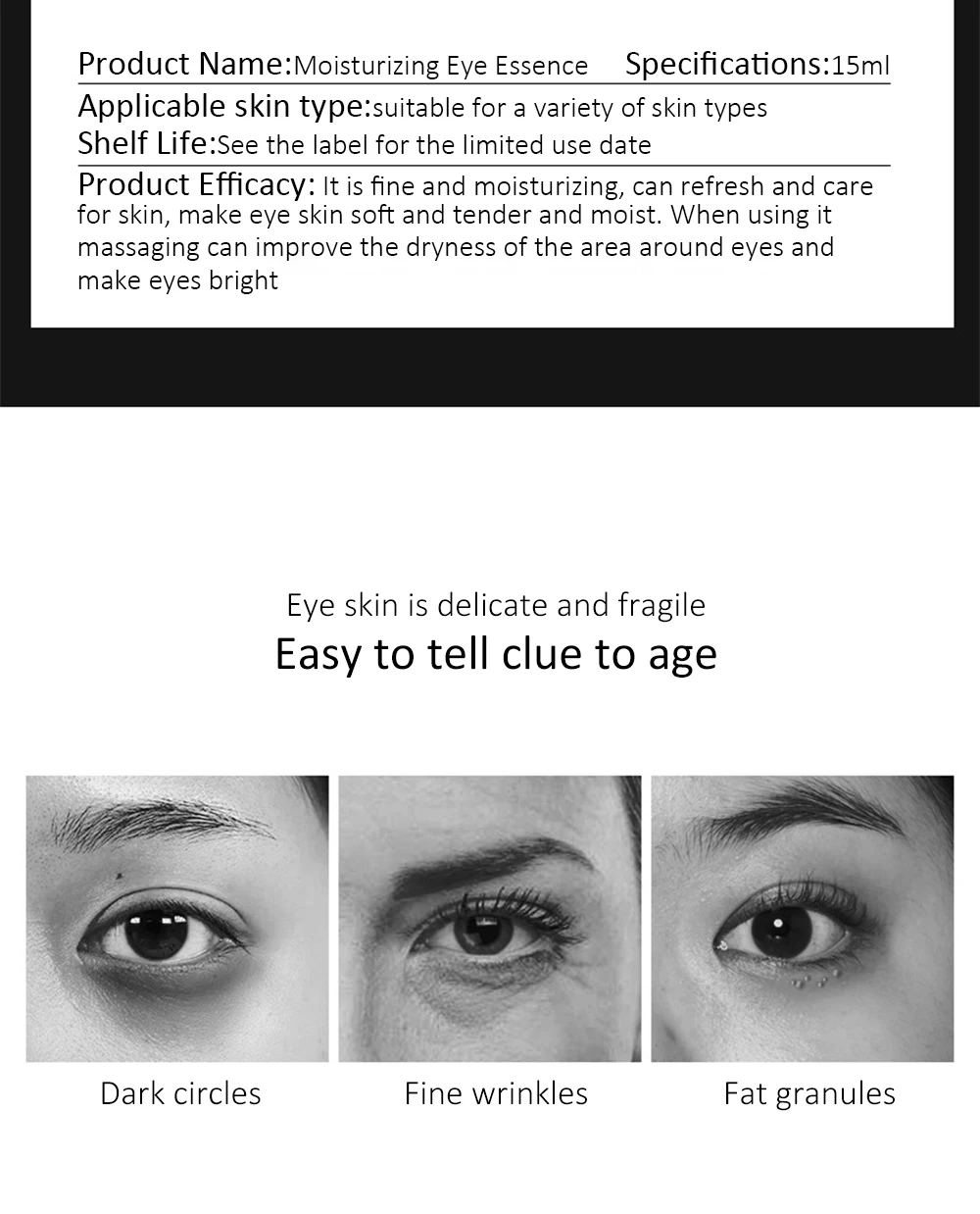 Срок годности: см. Этикетку для ограниченной даты использованияПодходит: различные типы кожиЭффективность продукта: он тонкий и увлажняющий, может освежить и ухаживать за кожей, сделать кожу вокруг глаз мягкой, нежной и влажной. При его использовании массирование может улучшить сухость области вокруг глаз и сделать глаза яркимиНежная и хрупкая кожа глазЛегко сказать ключ к возрастуТемные кругиМелкие морщинкиЖировые гранулы