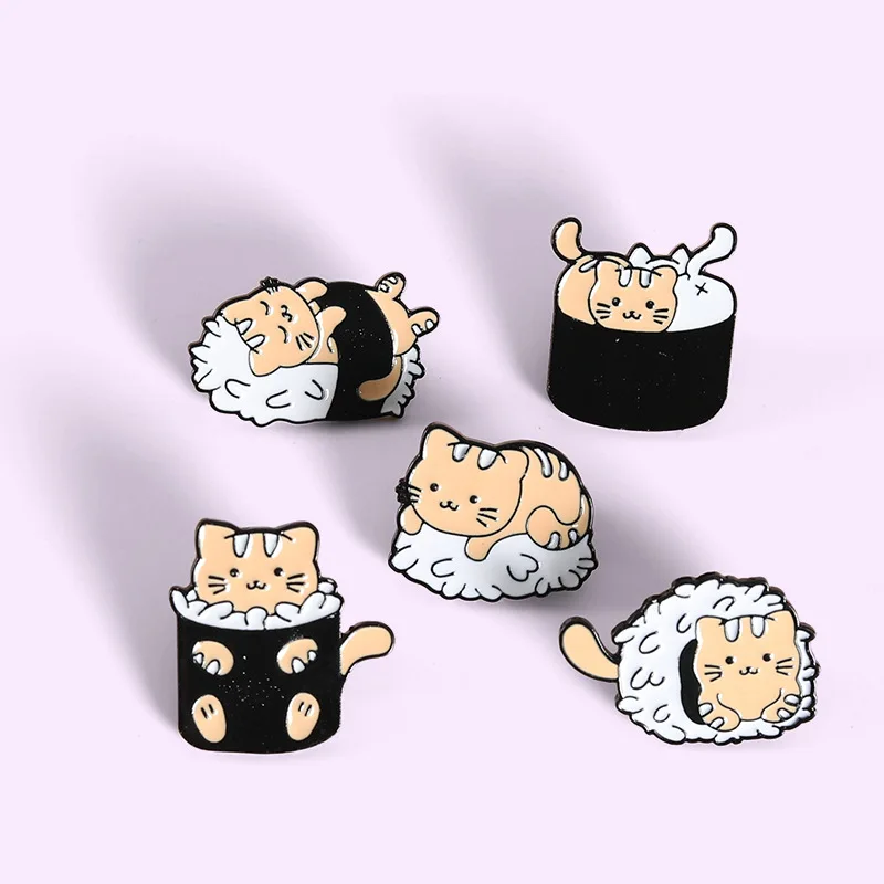 Броши с эмалью в виде мультяшных животных, суши, рисовый шар, кошка, онигири, кошка, Нагрудный значок, значок на рюкзак, аниме, ювелирное изделие, подарок, оптовая продажа