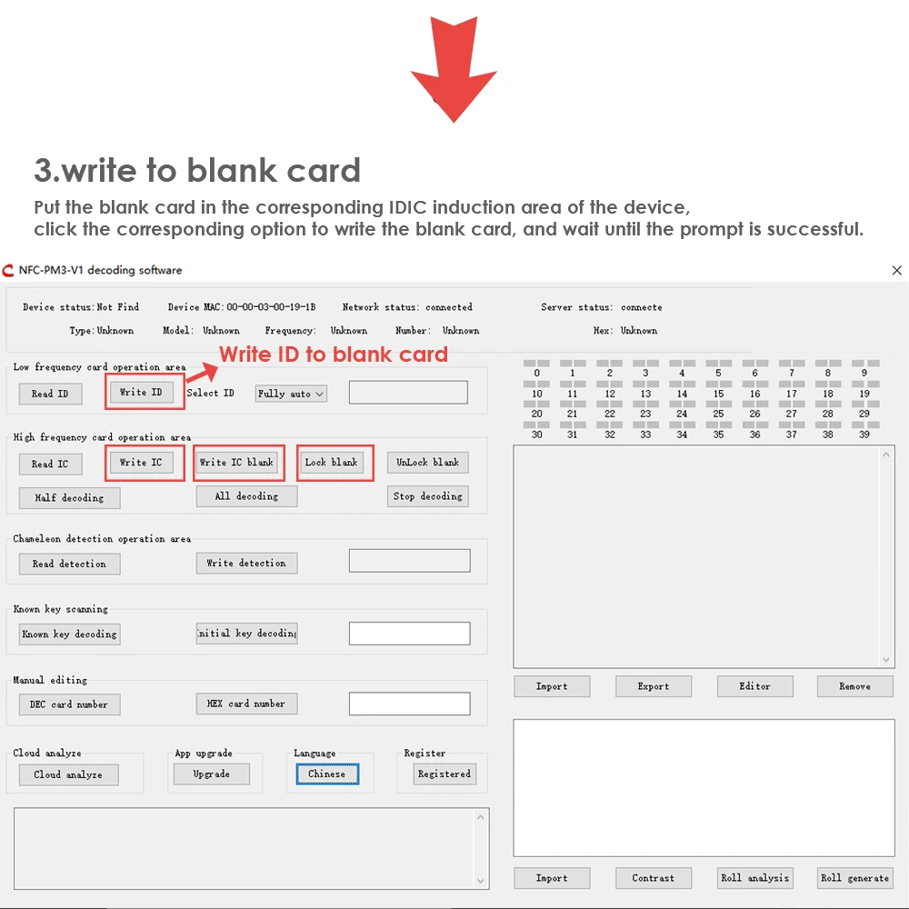 1. Сначала Дешифруйте данные, сохраненные в оригинальной карте; 2. Возьмите оригинальную карту, чтобы провести контроль доступа или лифт; 3. После проветривания, снова Дешифруйте оригинальную карту; 4. Используйте функцию сравнения программного обеспечения, чтобы сравнить, соответствуют ли данные до и после прокрутки карты; Примечание: Если данные из двух частей несовместимы, пожалуйста, свяжитесь со службой поддержки клиентов. Если они последовательны, они могут быть скопированы напрямую.
