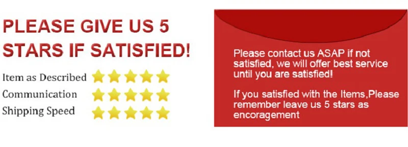1. Пожалуйста, оставьте отзыв с 5 звездами, если вы удовлетворены нашими продуктами и услугами, Мы будем признательны (товар, как описано, 5 звезд, общение 5 звезд, время доставки 5 звезд).2. Если вы получили поврежденный товар или неправильный стиль, пожалуйста, не оставляйте сначала отрицательный отзыв, пожалуйста, свяжитесь с нами, мы разберемся с этим и выработаем лучшее решение, ваше удовлетворение-это наше стремление к лучшему.
