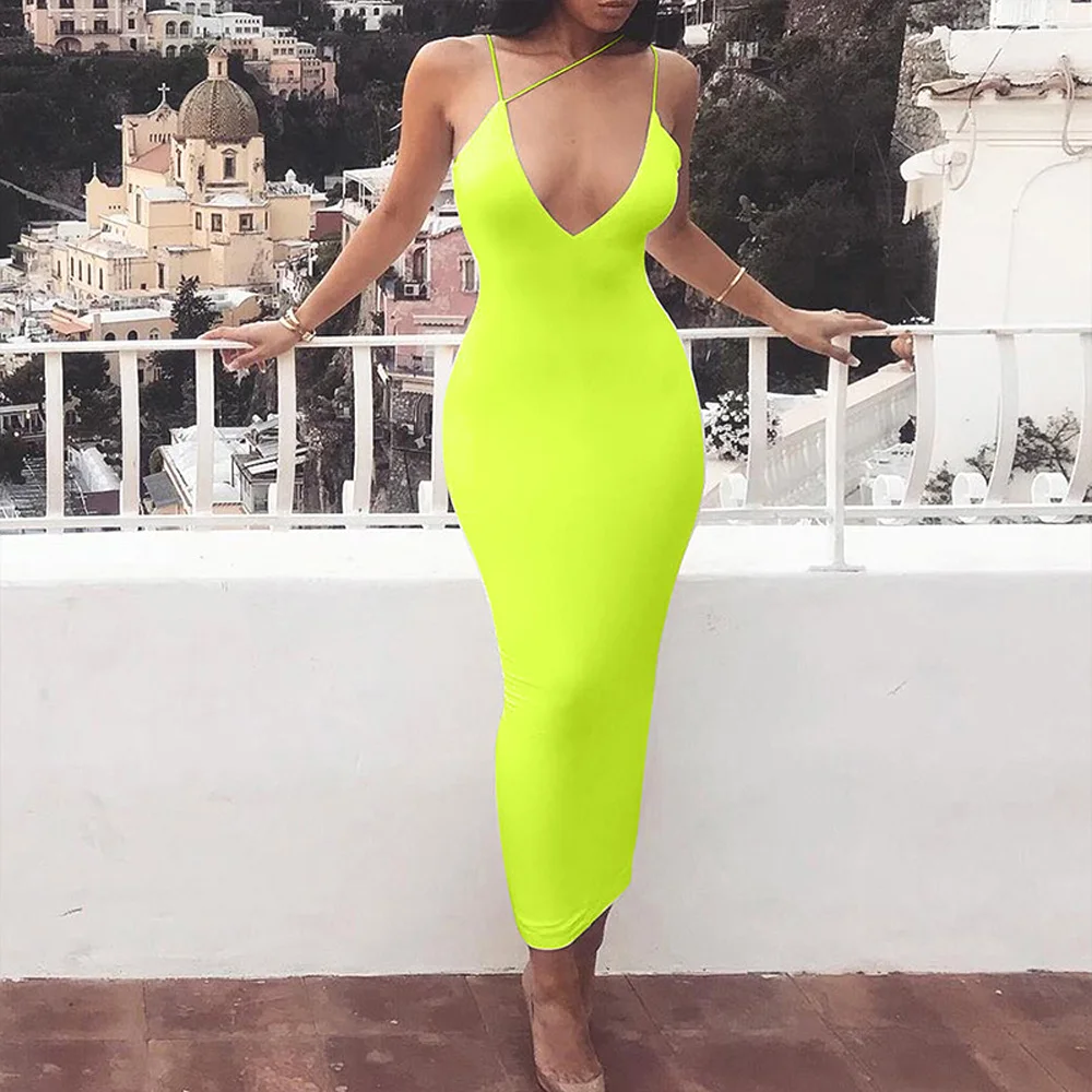 Длинное офисное ФЛУОРЕСЦЕНТНОЕ платье на тонких бретелях с V-образн...