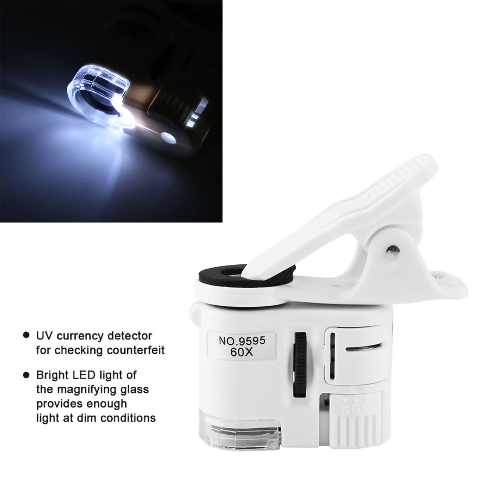 Увеличительное стекло 9595 Вт 60X, СВЕТОДИОДНЫЙ УФ светильник свет, мини-микроскоп с зажимом