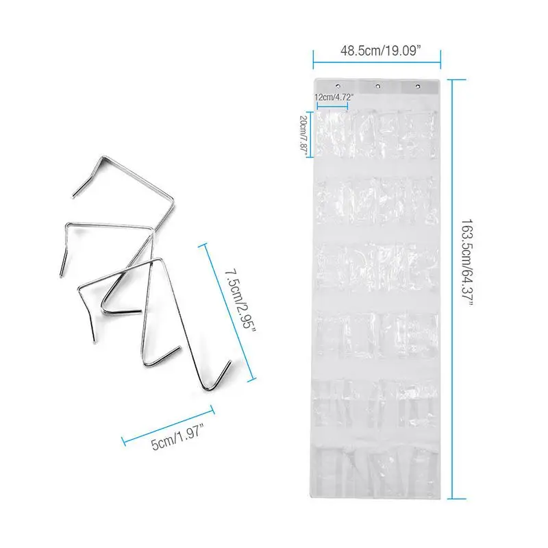 Эта простая в сборке сумка для обуви через дверь имеет 24 прозрачных виниловых кармана для хранения и защиты до двенадцати пар обуви. Эта сумка для обуви легко собирается с помощью прилагаемых крючков и удобно висит над дверцами стандартного размера. Карманы сделаны из прозрачного пластика, чтобы вы могли легко определить нужную вам обувь.
