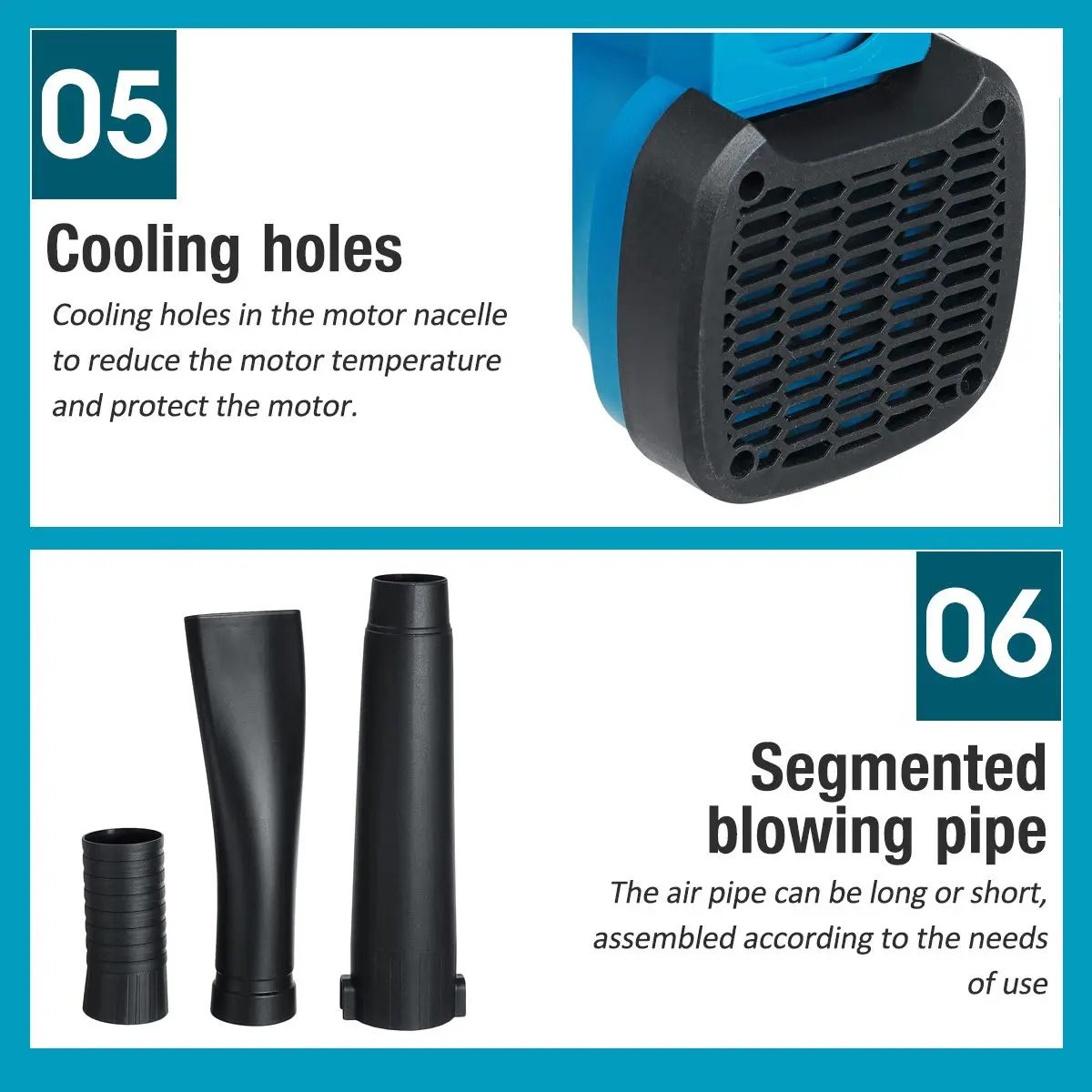 Особенности:-Компактный эргономичный дизайн, стабильный и удобный захват, не болят руки при работе в течение длительного времени.-Быстрая установка, удобная и быстрая установка и разгрузка аксессуаров и хоста.-Мощный мотор, медный сердечник, большая мощность, более длительный срок службы-Шестискоростная регулировка скорости, различные сцены используют различные скорости, эффективно продлевая срок службы двигателя-Охлаждающие отверстия, Охлаждающие отверстия в двигателе nacelle для снижения температуры двигателя и защиты двигателя.-Сегментированная дуя труба, воздушная труба может быть длинной или короткой, собранная в соответствии с потребностями использования