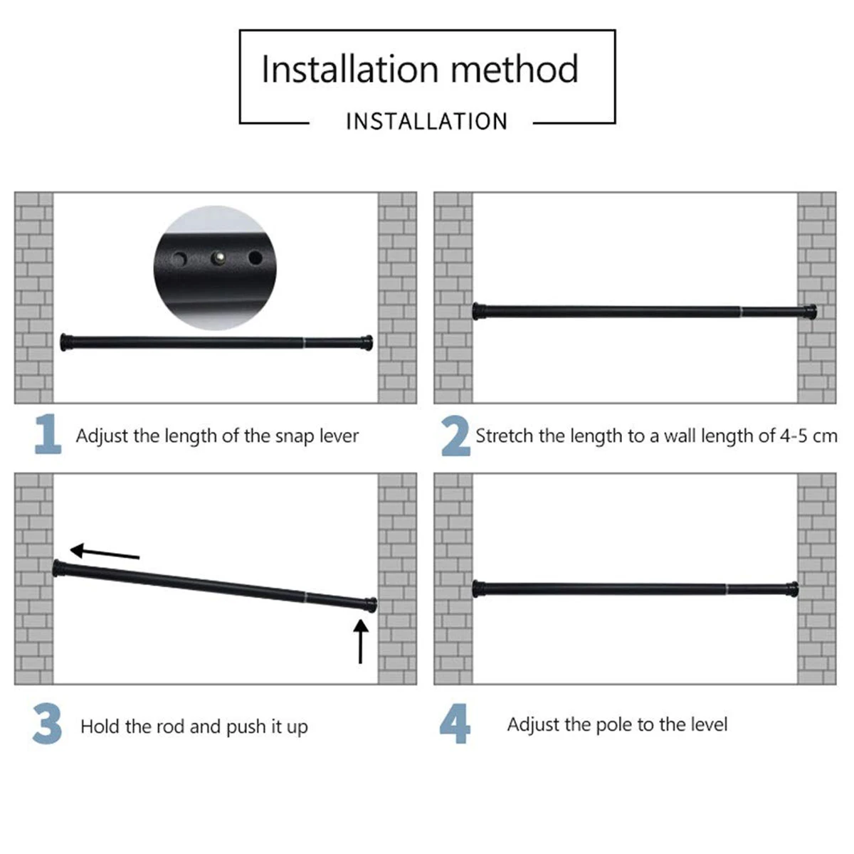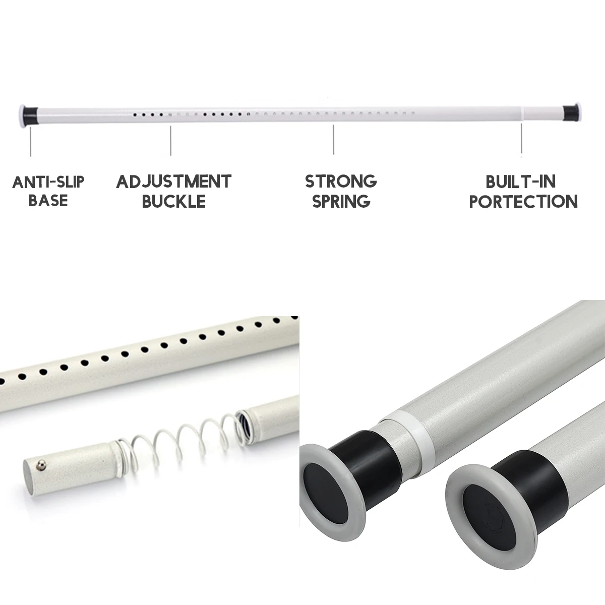 Особенности:◆ Толстая стальная труба из нержавеющей стали диаметром 32 мм, устойчивая к коррозии.◆ Встроенная прочная пружина, чем плотнее сжатие пружины, тем больше сила нагрузки.◆ Противоскользящая основа. Легко установить. Нет необходимости пробивать отверстия, не повреждая поверхность стены.◆ Встроенная Регулируемая пряжка, регулируемая длина и выдвижная.◆ Многоцелевой-можно использовать не только в ванной, но и в качестве подвесной рейки в гардеробе, на балконе или даже в магазине одежды для хранения или демонстрации одежды.