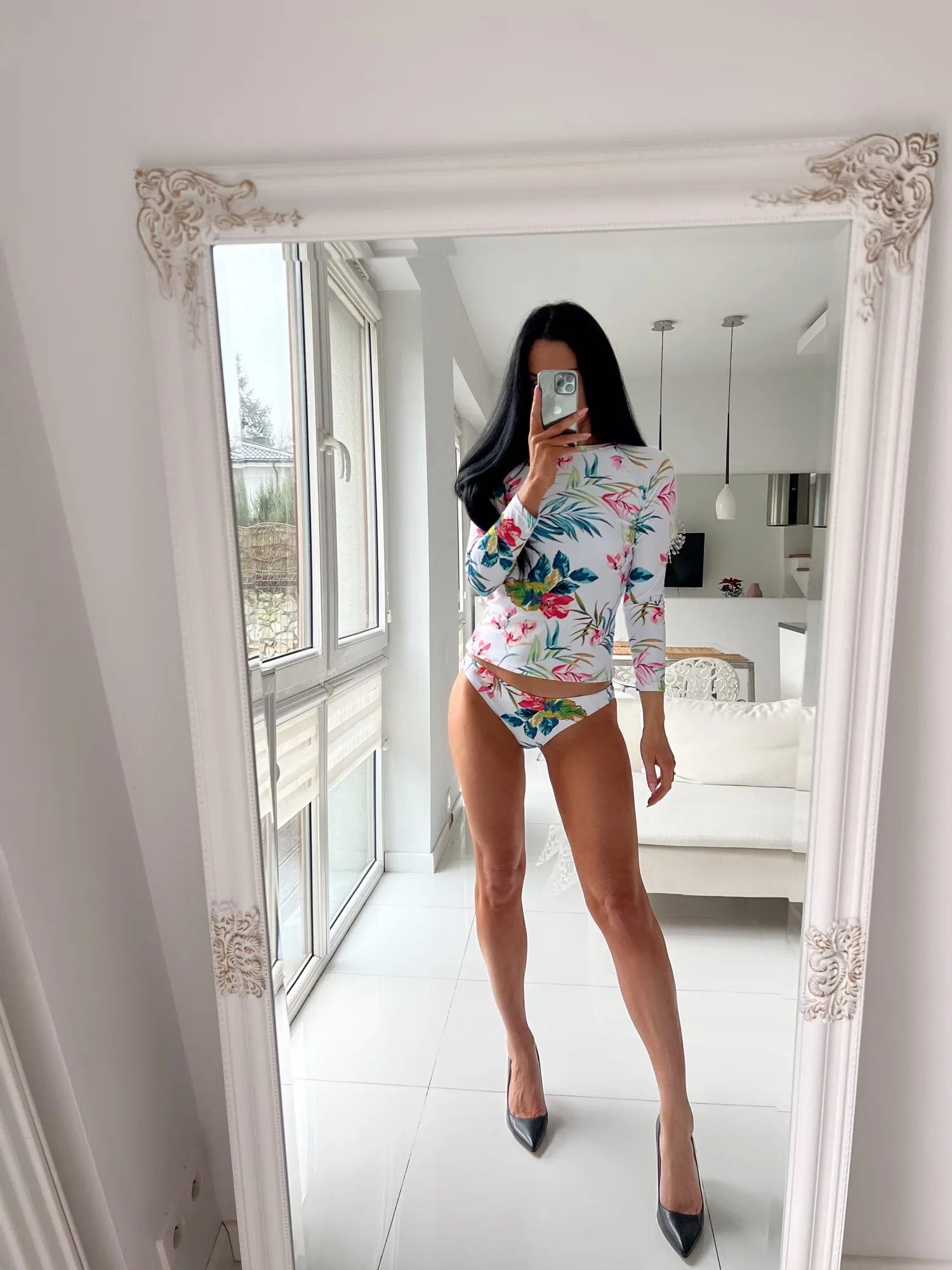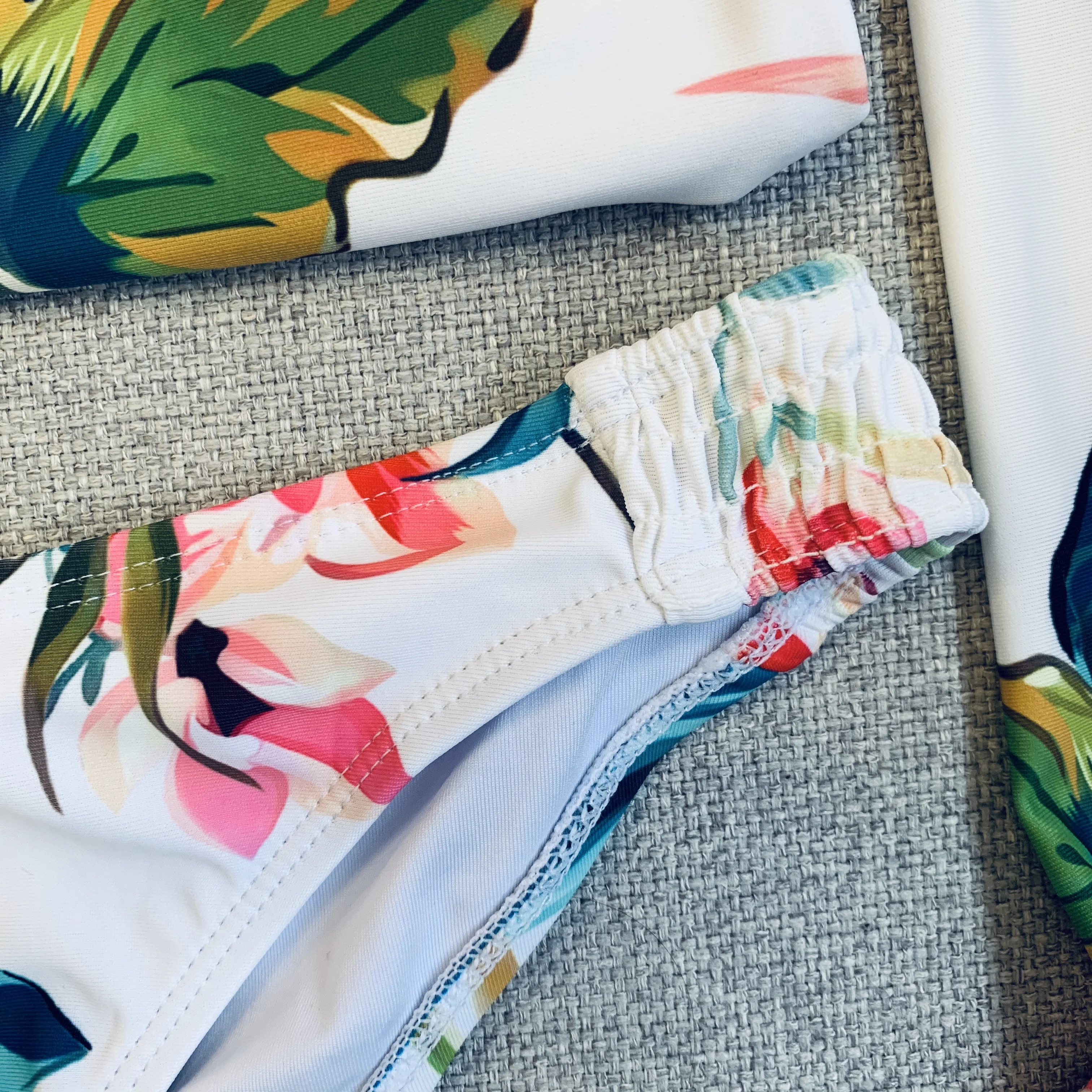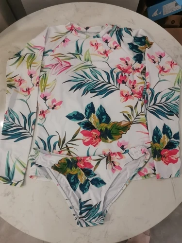 Купальник из двух предметов с нежным цветочным принтом. Идеально подходит для водных видов спорта. Топ с длинными рукавами; Обхват груди; Слегка ПОДБИТАЯ ткань. Вниз с более высоким уровнем. Я ношу размер M параметры 88/68/92 174 см, 56 кг Размер идеально.