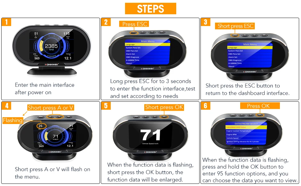 Детали и характеристики KONNWEI KW206 1. Цветной ЖК-экран с высоким разрешением может отображать параметры вашего автомобиля в режиме реального времени для повышения безопасности вождения и не наклонять голову.2. Настройка параметров системы: единицы измерения (метрическая система, имперская система)/клавишный звуковой переключатель, звуковой переключатель сигнализации, яркость экрана, Вращение экрана, подсказки протокола связи и т. Д.3. OBD para set OBD Настройка потока данных: Установка параметров автомобиля для уточнения расчета расхода топлива и т. Д.4. Набор сигнализации: может быть установлен для превышения определенного установленного значения. Продукт будет звуковой сигнал дважды, и шрифт будет мигать красным, чтобы напомнить. Элементы, которые могут быть установлены: сигнализация скорости двигателя об/мин, сигнализация скорости вождения VSS, сигнализация температуры воды в двигателе и т. д., сигнализация перенапряжения напряжения двигателя.5. OBD диагностирует диагностику транспортного средства OBD: поддерживает чтение, очистку, поток данных 6,0-100 км время: 0-100 км Испытание на ускорение, время, необходимое для тестирования для ускорения до 100 км/ч.7. Разнообразный дисплей функции параметров автомобиля, поддерживает отображение в реальном времени 95 единиц данных, включая уровень топлива, значение нагрузки двигателя, расход топлива.8. Поддерживает полный протокол OBD2, включая двойной протокол J1850.9. Переключатель блока поддержки, имперский блок и метрический блок, или переключатель единицы параметра отдельно, например, км --- миля.10. Быстрая скорость обновления данных, низкая задержка и быстрая реакция.11. Автоматически выключается и выключается, и автоматически засыпается, когда напряжение ниже, чем пламя двигателя. После сна низкое энергопотребление не должно быть отключено.12. Поддержка обновления и обновления.13. Автоматическое переключение между дневной и ночной яркостью.