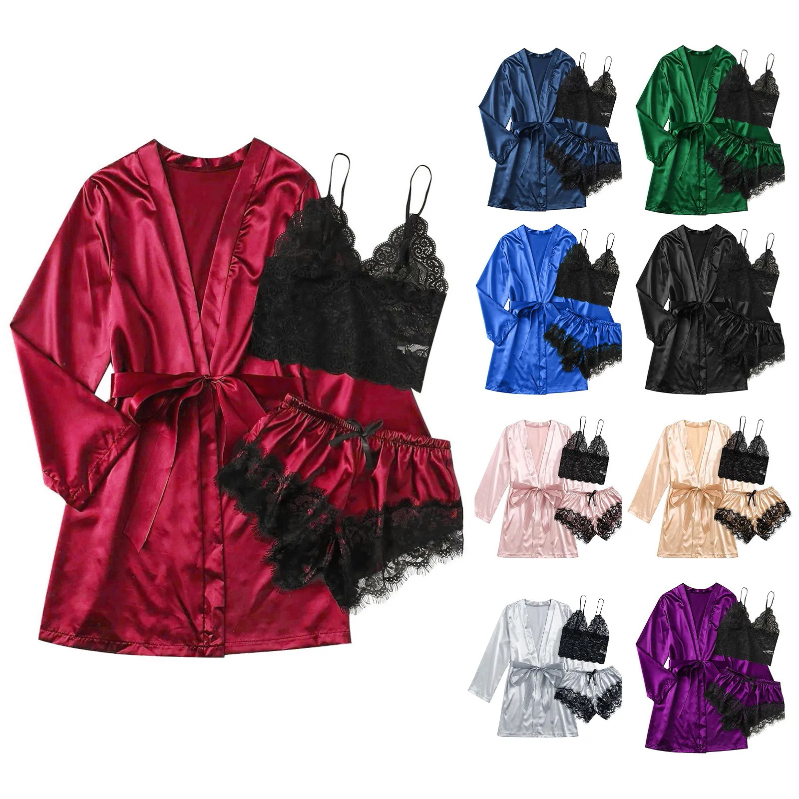 Пикантная атласная Шелковая пижама, 3 шт., женская ночная рубашка, нижнее белье, халаты, пижамные комплекты, нижнее белье, женская пижама