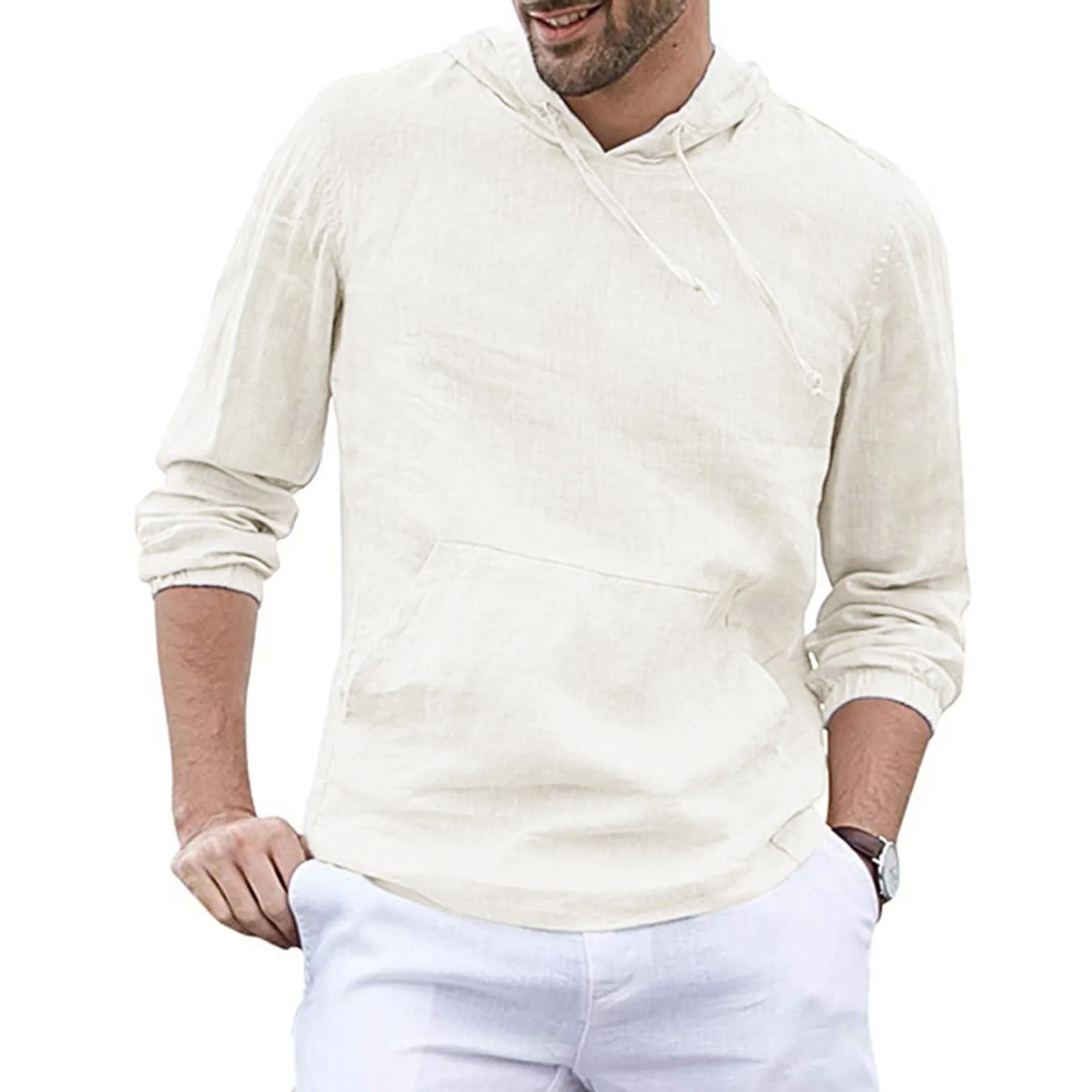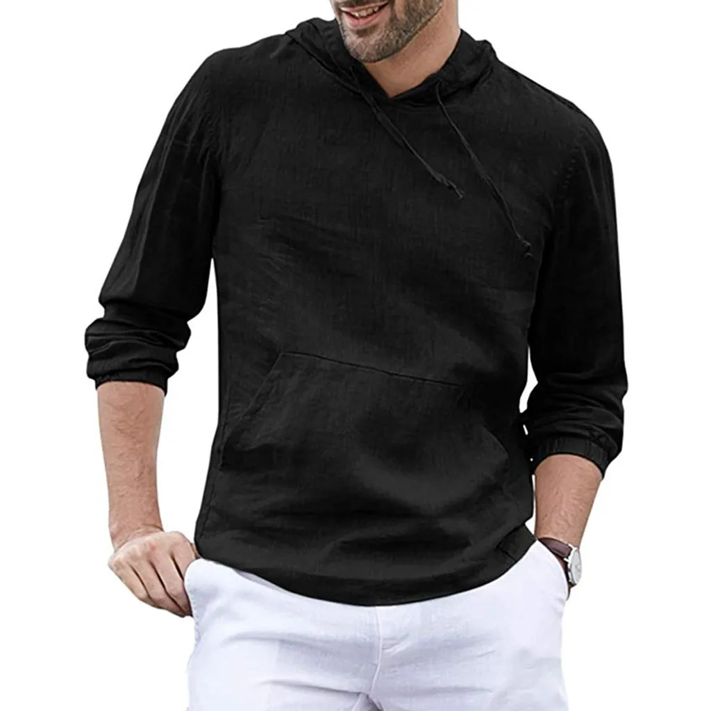 Мужская Однотонная рубашка с капюшоном из хлопка и льна с длинными рукавами и карманами для рук, бархатные теплые Повседневные пуловеры с карманами, свитшоты, топы
