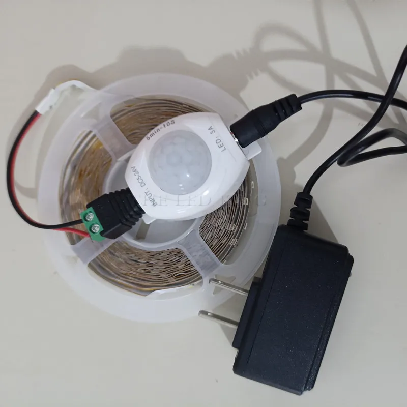 Цветовая температура: теплый белый 3500K/белый 6500K Вход: 85-265VAC 60 Гц Выход: DC 12V 1A/2A Время задержки выключения: 30 с/10 мин Сенсор расстояние: ≤ 3,5 м Угол датчика: ≤ 120 ° Управление: окружающий светильник, автоматический мониторинг и функция датчика PIR в темной среде Потребление энергии: 6 Вт О длине: 1. Светодиодный светильник: 1 м/2 м/3 м/4 м/5 м 2. Кабель постоянного тока на адаптере: 1 м 3. DC кабель на ленточный светильник: 10 см Примечание: датчик работает только в темноте